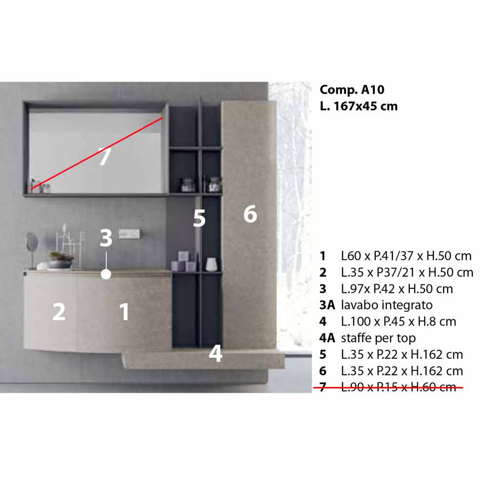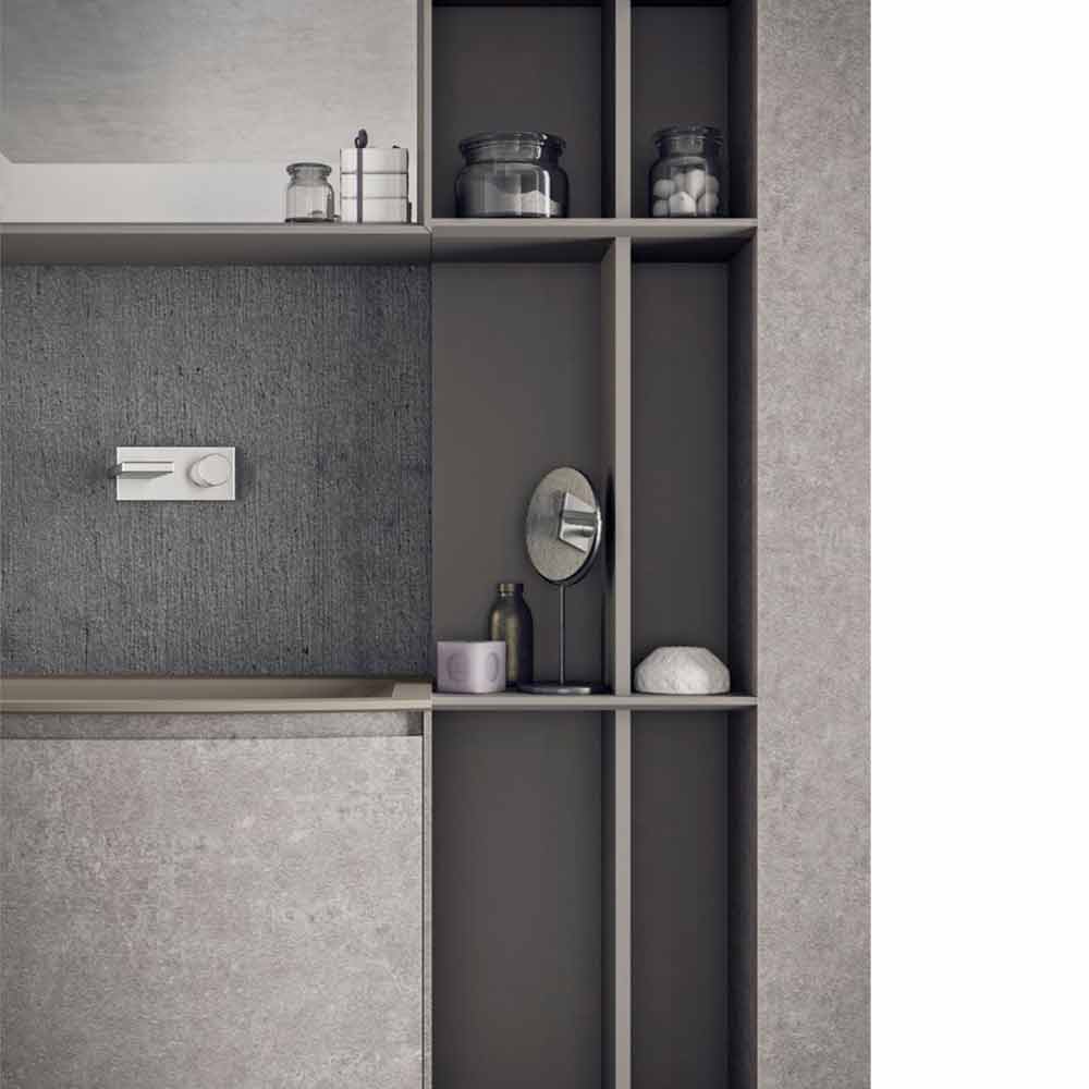Esta claridad formal viene dada por la puerta ranurada con perfil inclinado. La peculiaridad de esta composición viene dada por el lavabo encastrado caracterizado por dos lados laterales que descienden suavemente hacia el lavabo y por el mueble de pared curvo que lo contiene.