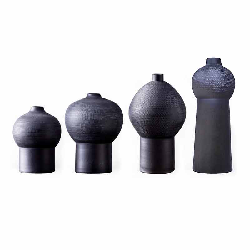 Composición de 4 jarrones de diferentes tamaños fabricados en cerámica decorada.