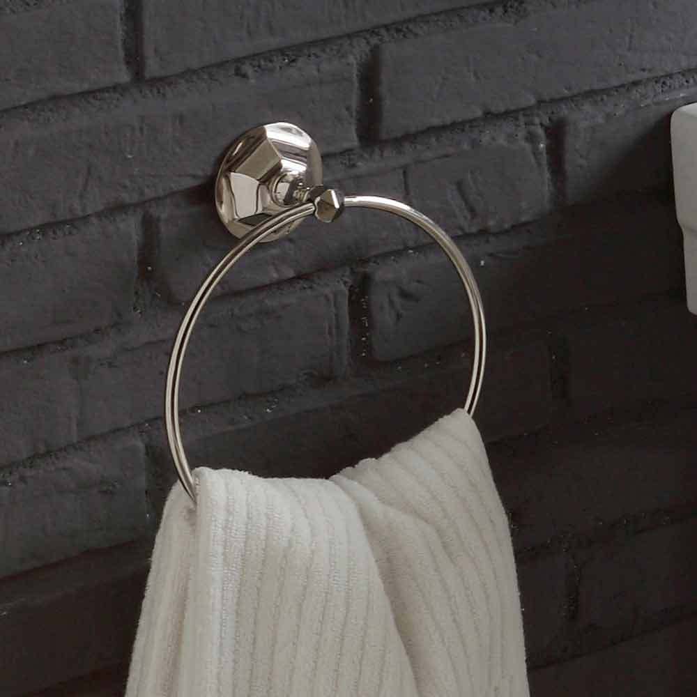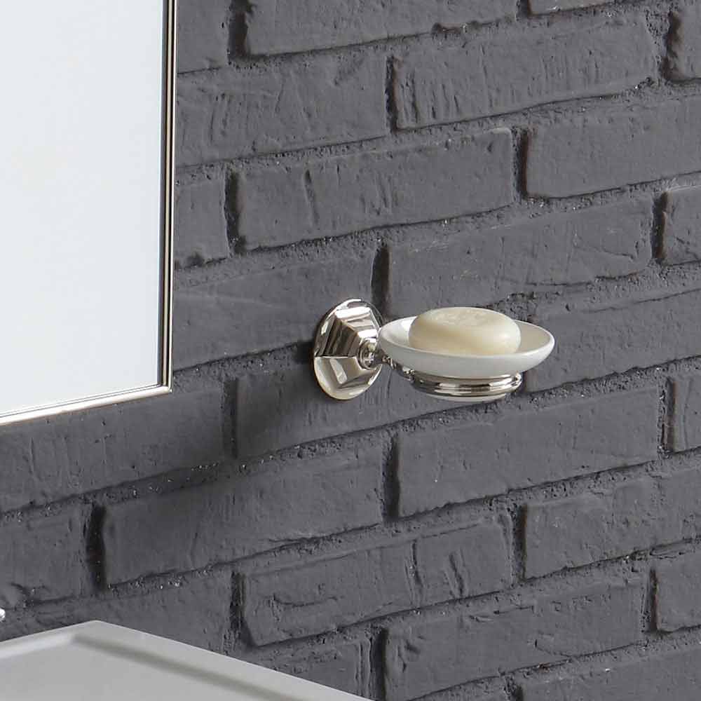 Ania se completa y enriquece con la presencia de un precioso y elegante jabonera de pared de cerámica con detalles cromados y un toallero con un creativo y original diseño de anillas, también en acabado cromado.