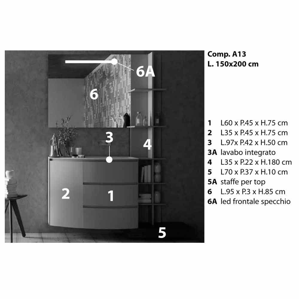 Composición de baño suspendida moderna, diseño curvo y regular con estantes abiertos, made in Italy.