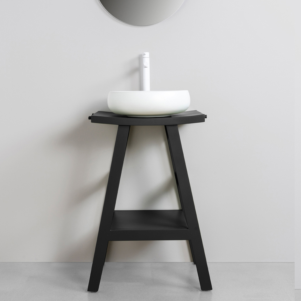 Composición de baño con mueble de suelo en teca negra natural y accesorios.