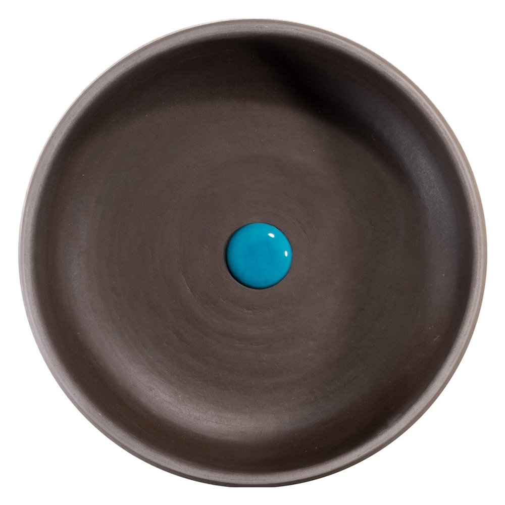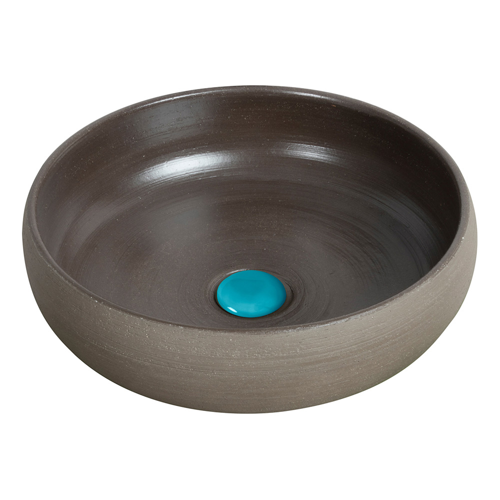 arcilla refractaria y tierras oscuras con cubrecama azul, es un producto