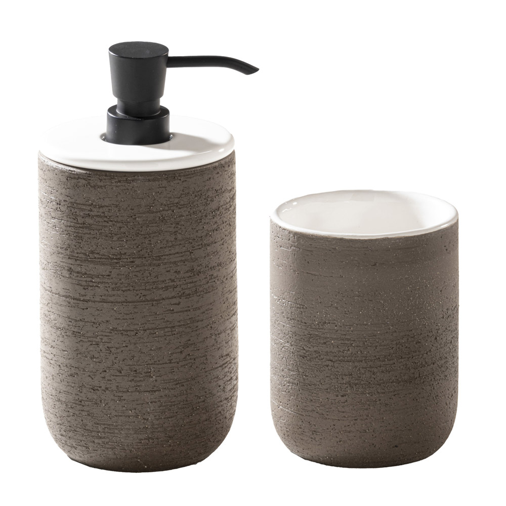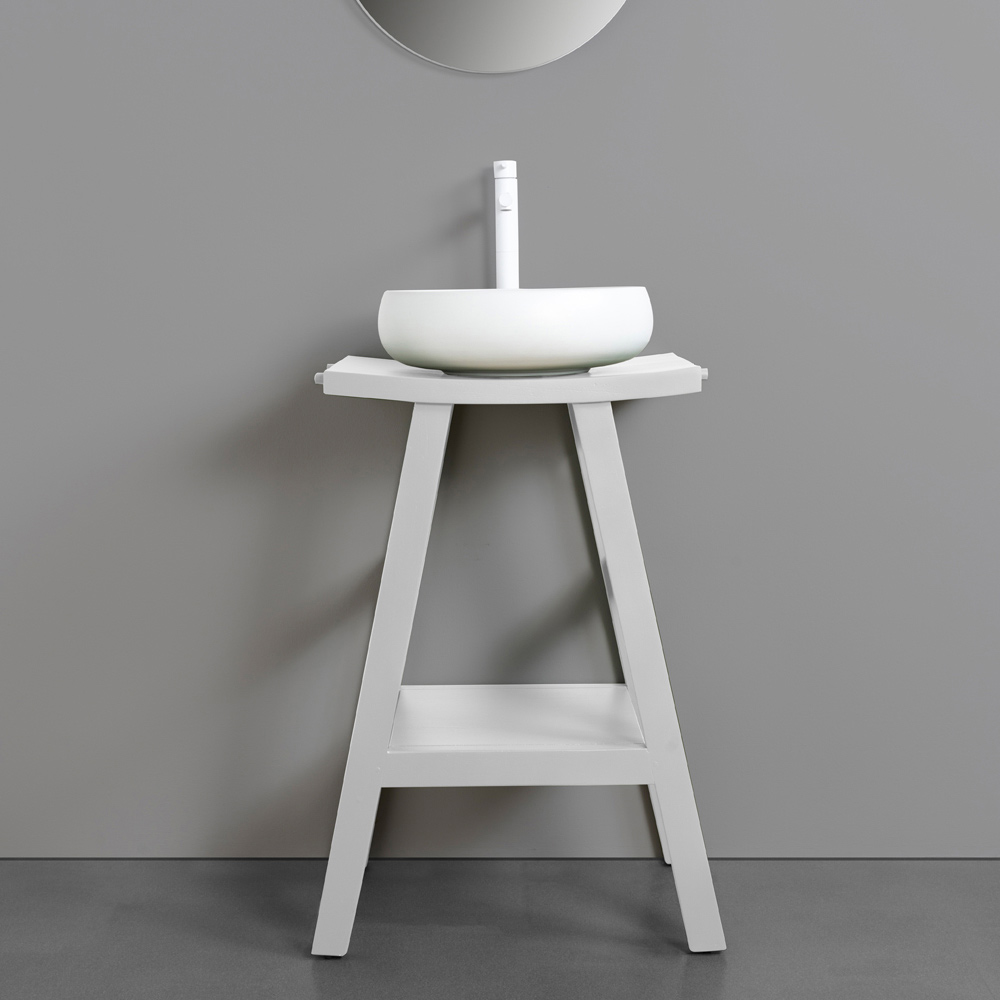 La composición del mobiliario de baño incluye un mueble de baño exento realizado en teca natural recuperada acabado blanco y complementos de encimera realizados en barro refractario y tierras oscuras con interior esmaltado en blanco completamente Made in Italy. Estos accesorios se caracterizan por detalles como la almohadilla de neopreno para garantizar la protección de las bases de apoyo y el dosificador con dosificador de metal negro mate para garantizar una dosificación óptima del jabón.