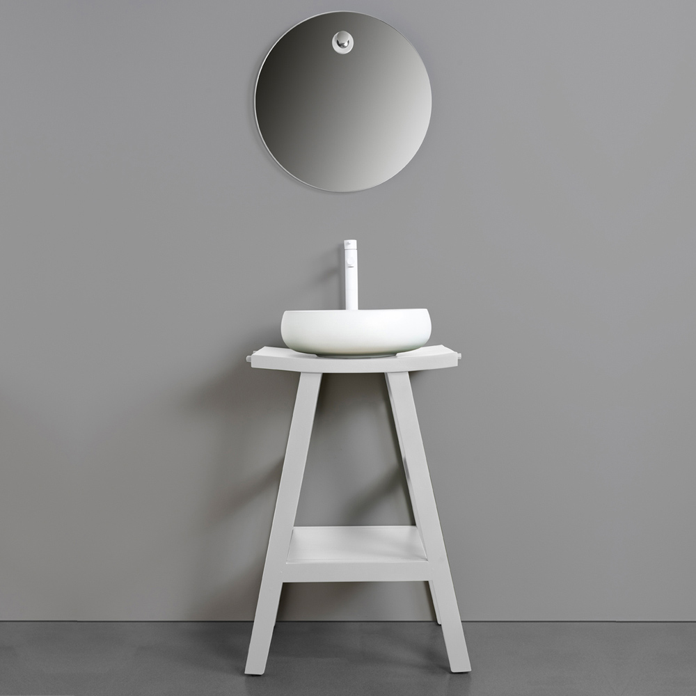 El lavabo sobre encimera realizado en arcilla refractaria y tierras oscuras en acabado blanco con cubrecama blanco, es un producto íntegramente Made in Italy con formas suaves y sinuosas que aúna funcionalidad y estilo inconfundible. El espejo de pared incluido en los accesorios de baño, fabricado en Italia, se completa con un orificio para colgar, acabado con un anillo de teca blanca torneada a mano e incluye un gancho cromado .