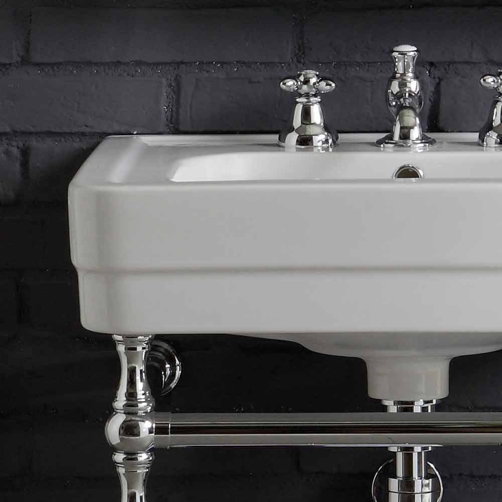 Partes incluidas en la composición: - Lavabo de cerámica blanca. Medidas: L.50 cm x P.40,5 cm - Base de metal completa con rejilla, en acabado cromado L.41 cm x A.76 cm x saliente de pared 34 cm - Grifo con desagüe - Sifón - Drenar - Espejo basculante rectangular con marco de latón cromado 76,5 cm x 57,5 cm. - Toallero de anillo - Jabonera de cerámica de pared