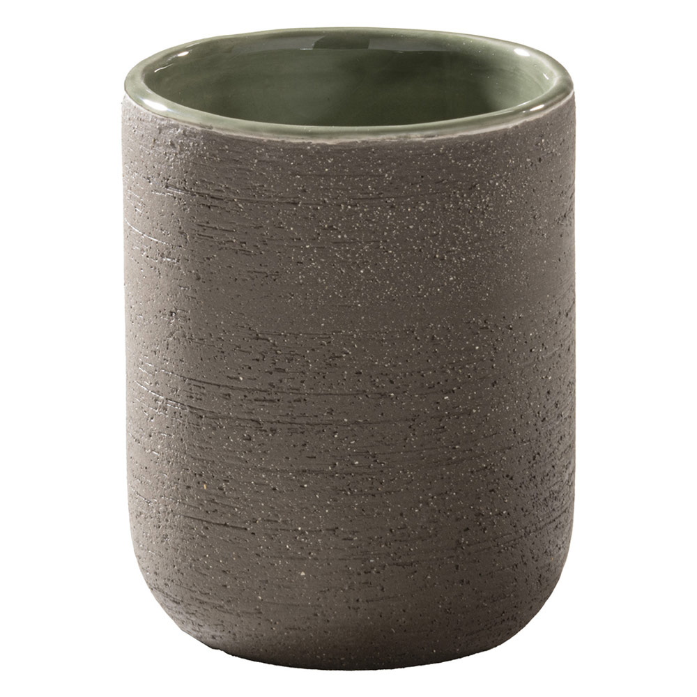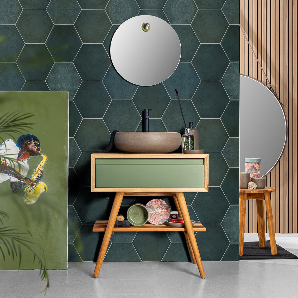 Composición de baño con lavabo de barro, complementos de encimera y espejo.