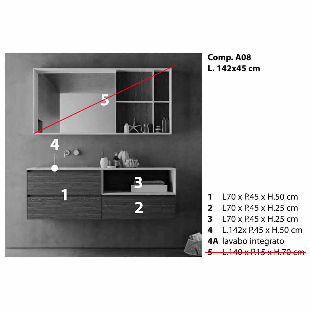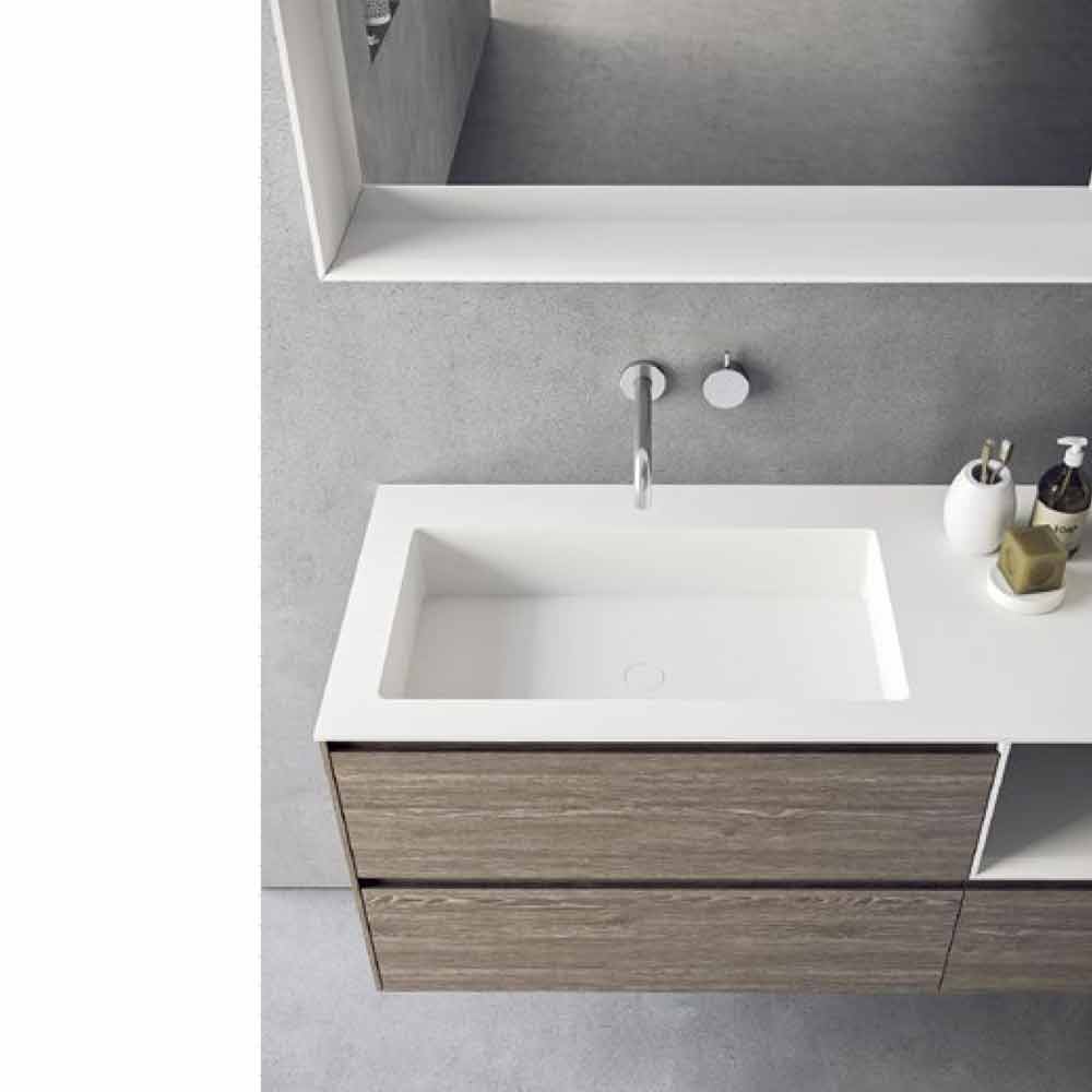 Composición de baño minimalista, diseño suspendido y curvo con lavabo integrado, made in Italy.