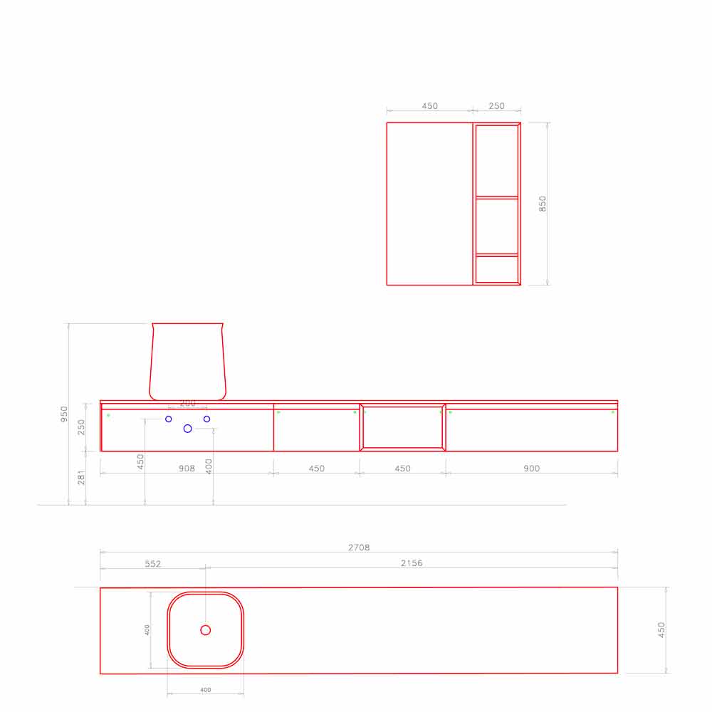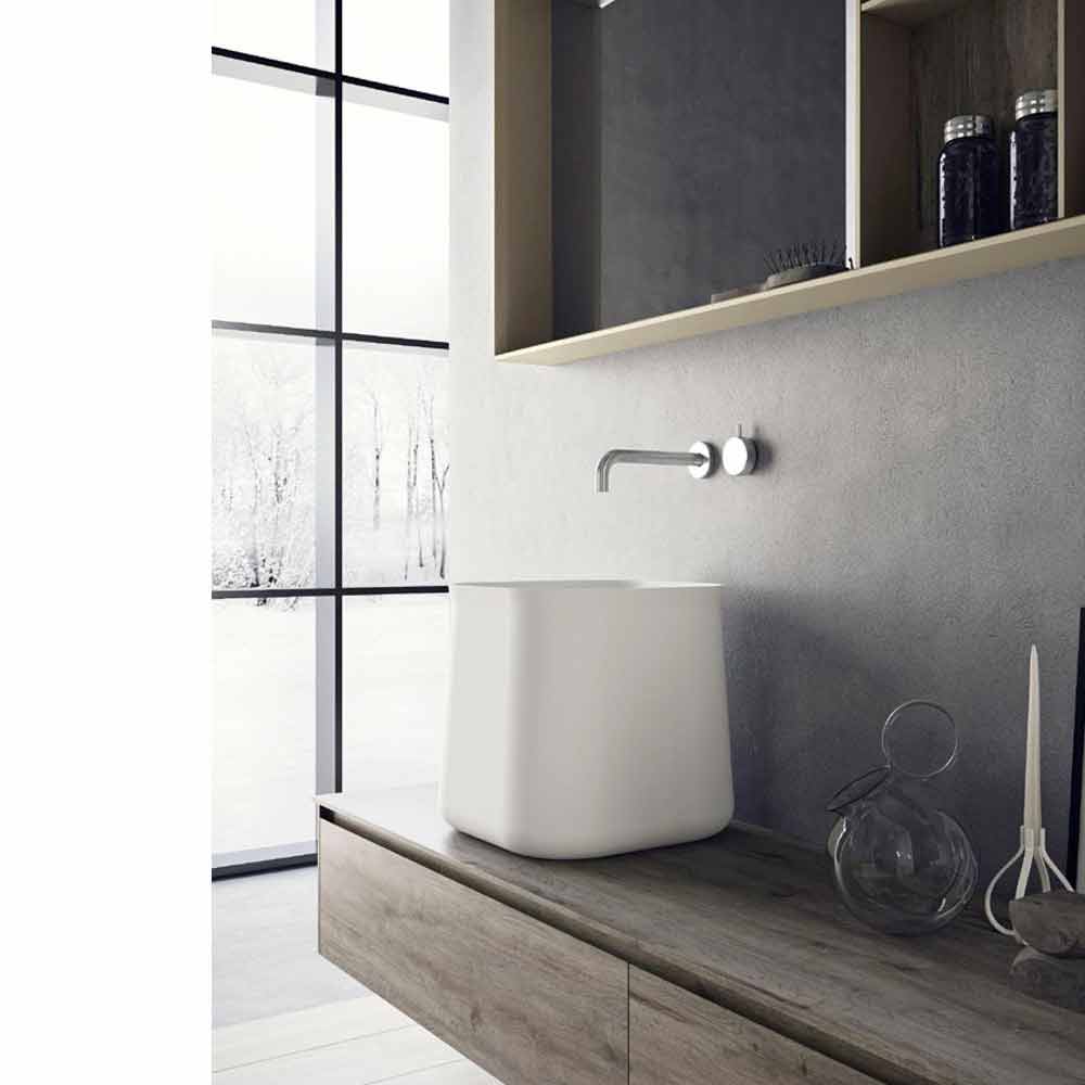 La peculiaridad de esta composición está dada por la silueta del lavabo alto sobre encimera , que se distingue por el borde que se abre hacia el exterior recordando la forma de un tulipán, frente a la linealidad de los compartimentos subyacentes, mitigando las formas.