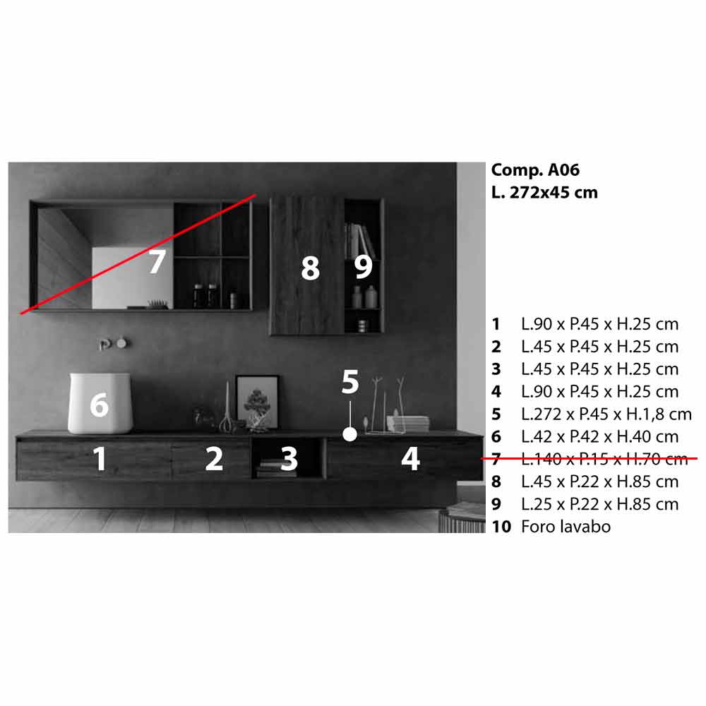 Composición de moderno mueble de baño, diseño suspendido y de brazos largos con lavabo sobre encimera, made in Italy.