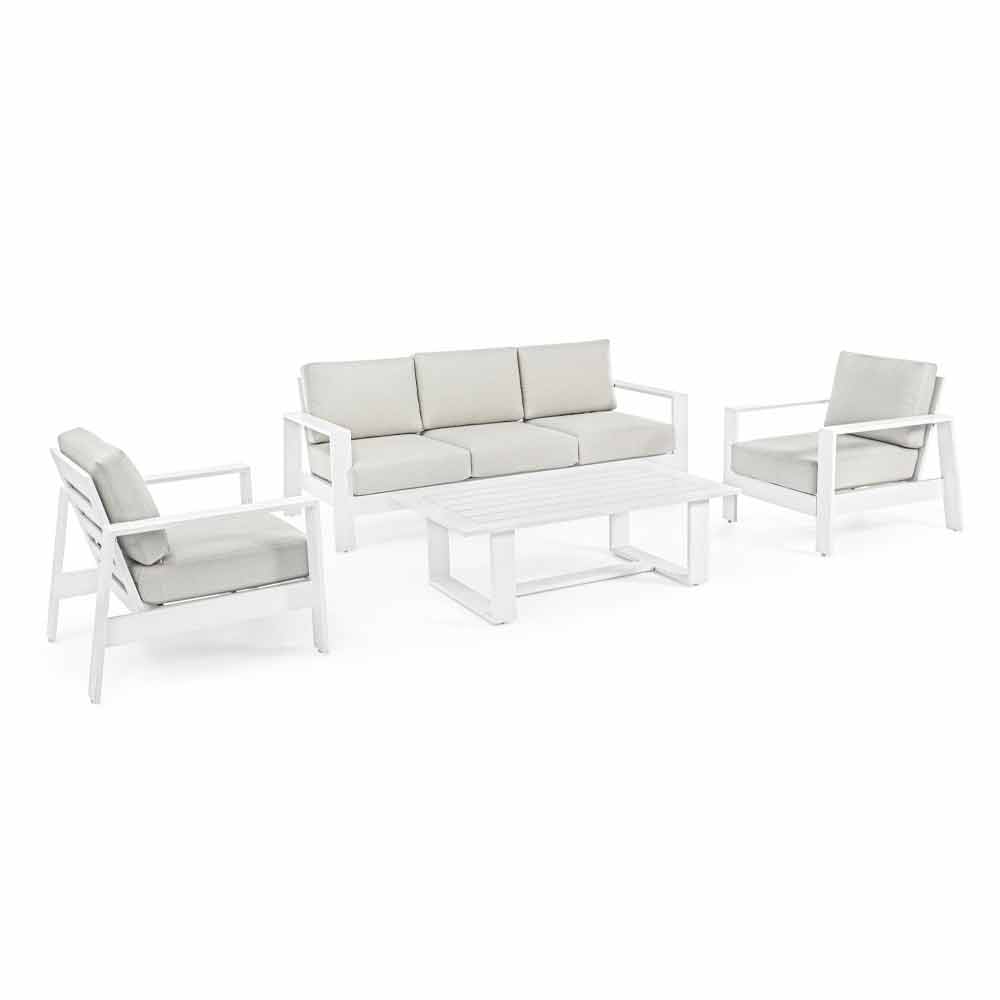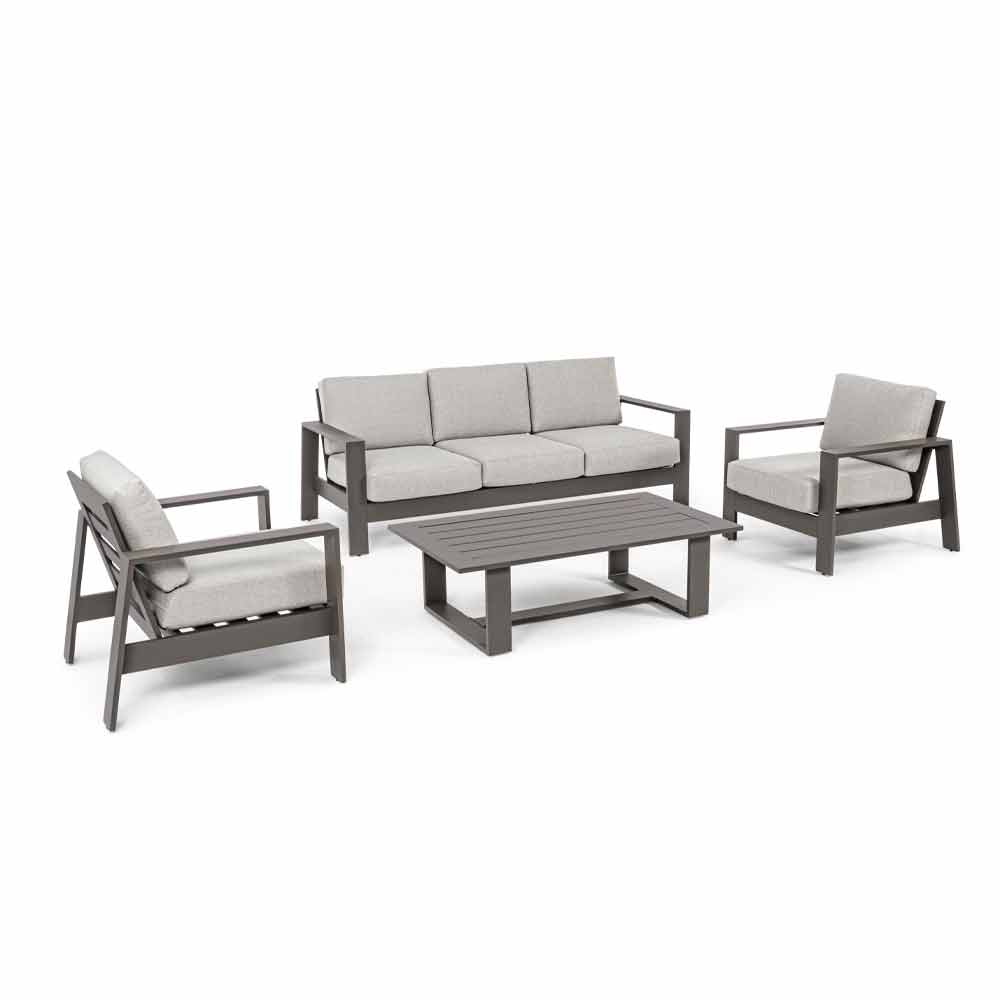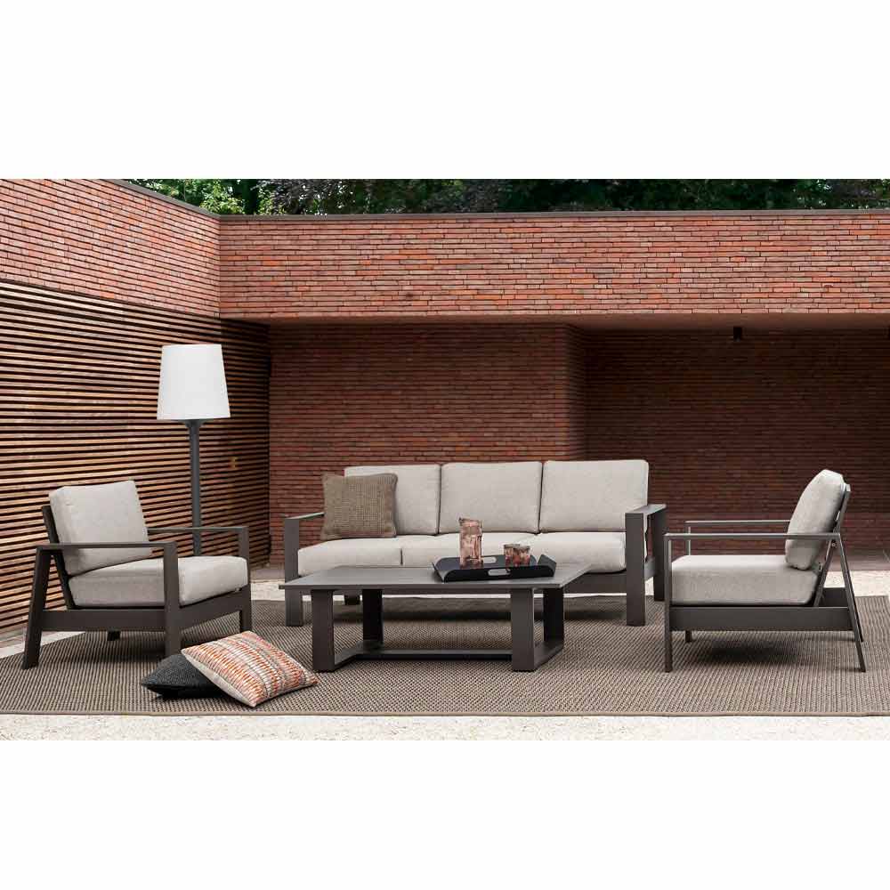 Salón exterior con sofá, sillones y mesa de centro de aluminio.