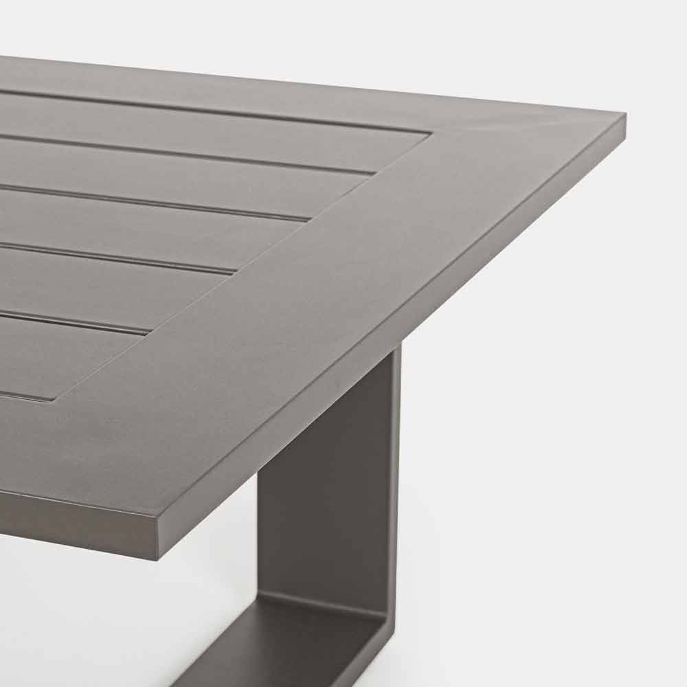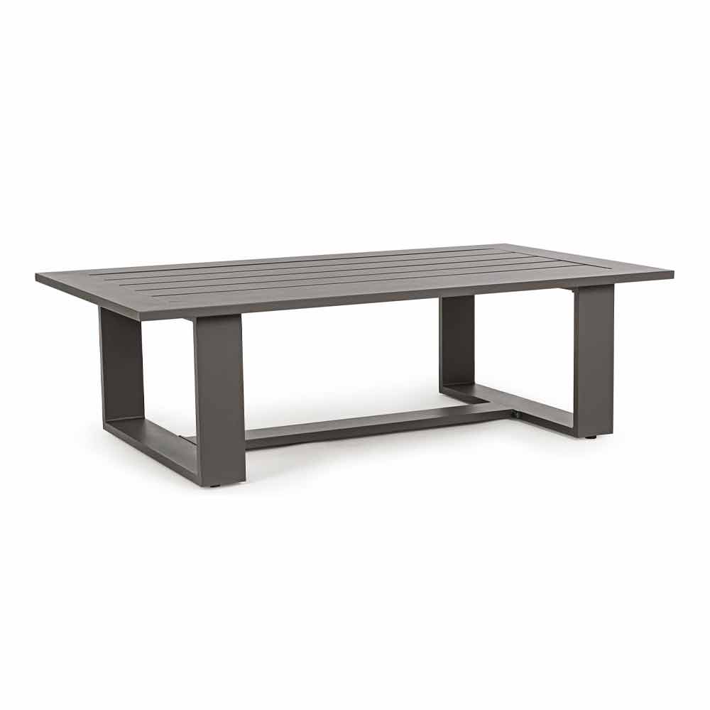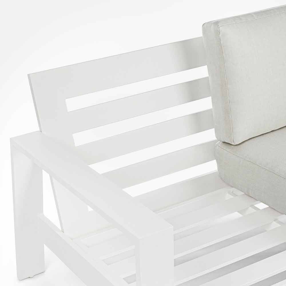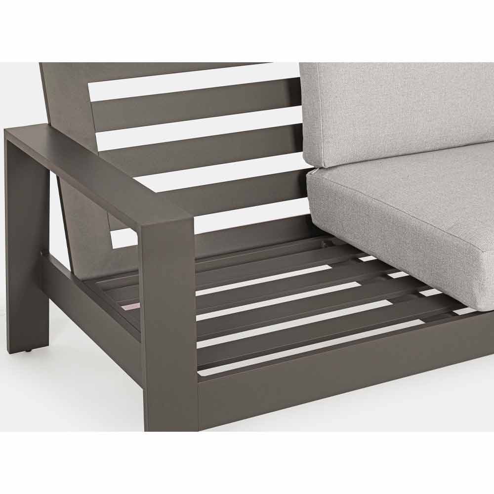 Salón exterior con sofá, sillones y mesa de centro de aluminio.