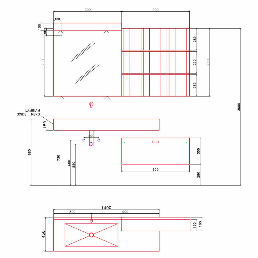 La composición es de roble termotratado, lavabo suspendido en óxido laminado negro.