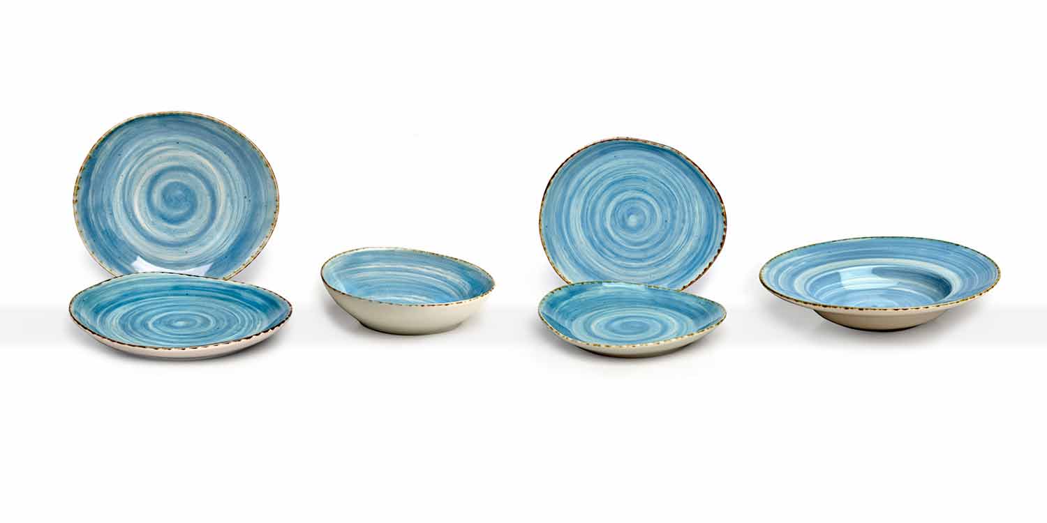 - Originalidad : las formas irregulares, las decoraciones con pinceladas imprecisas y con un efecto moteado acabado y pintado a mano y el borde envejecido, resaltan el estilo rústico y terroso de la colección. Cada diferencia entre una pieza y otra debe considerarse como una característica adicional de valor y personalidad, que hace que cada pieza sea única.