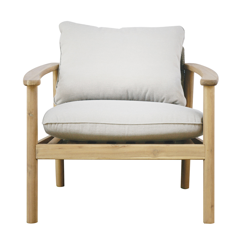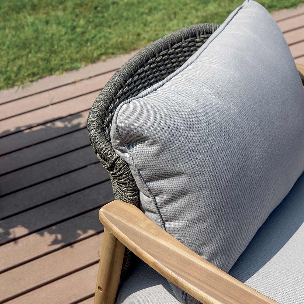 La estructura de madera de acacia aporta solidez y calidez, mientras que los detalles de cuerda tejida en color antracita aportan un toque moderno y sofisticado. Los cojines grises extraíbles garantizan una comodidad excepcional y un fácil mantenimiento, conservando el aspecto refinado y acogedor de la sala de estar con el paso del tiempo.