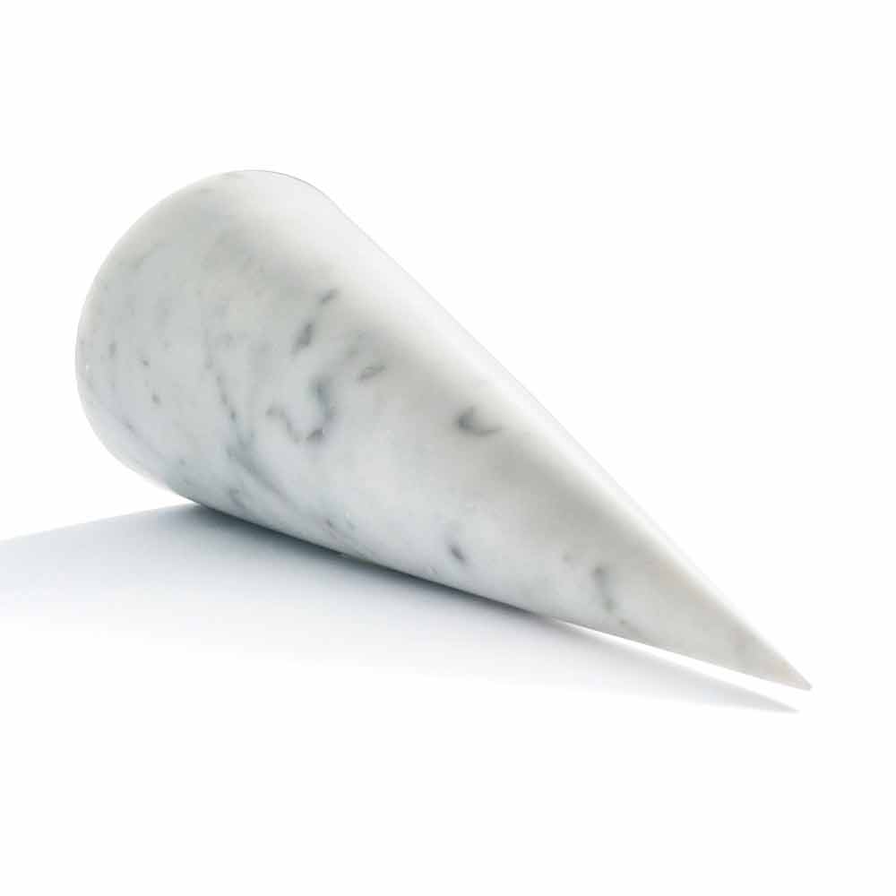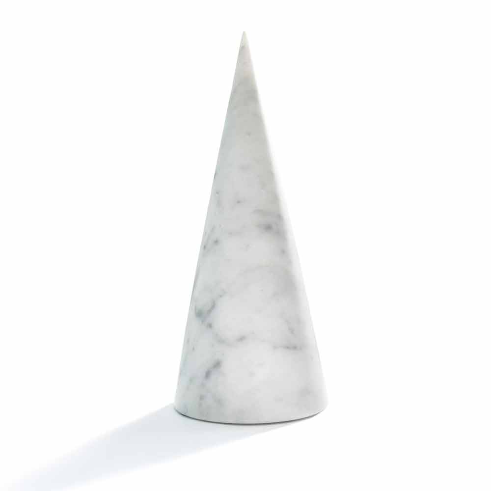 Gran cono decorativo fabricado en mármol blanco de Carrara . Es una pieza única ya que cada bloque de mármol utilizado se diferencia de los demás por vetas y matices.