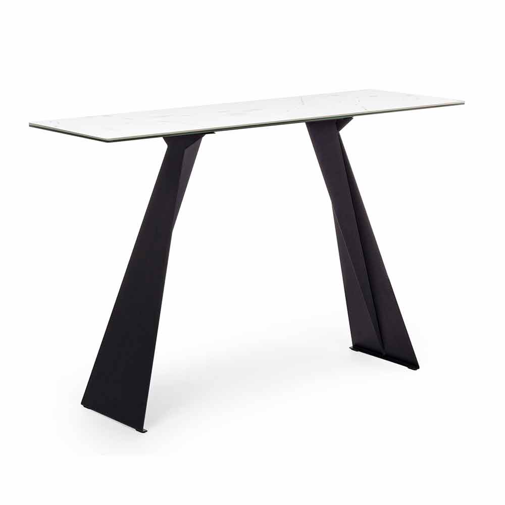 Esta consola de diseño cuenta con patas de acero con recubrimiento de polvo epoxi y una superficie de cerámica de 5 mm de espesor sostenida por una capa de vidrio templado de 6 mm de espesor.