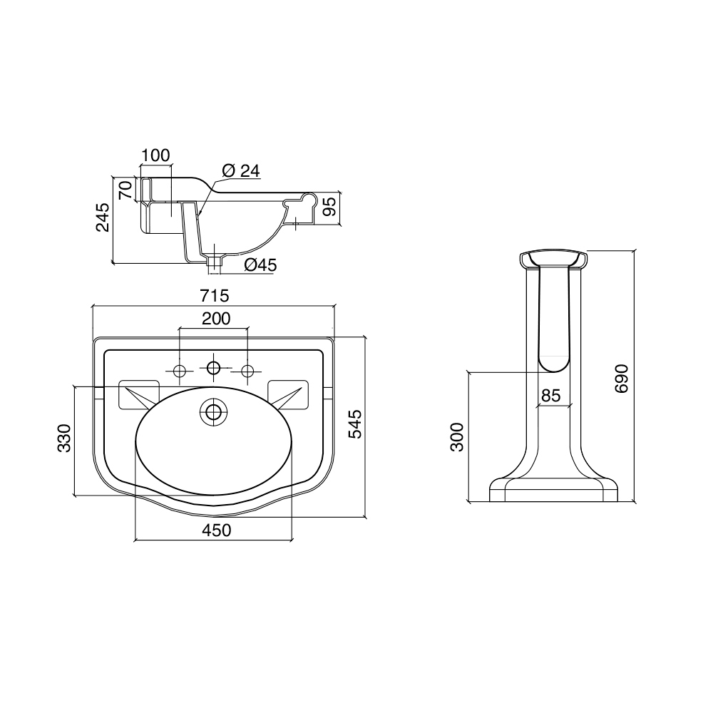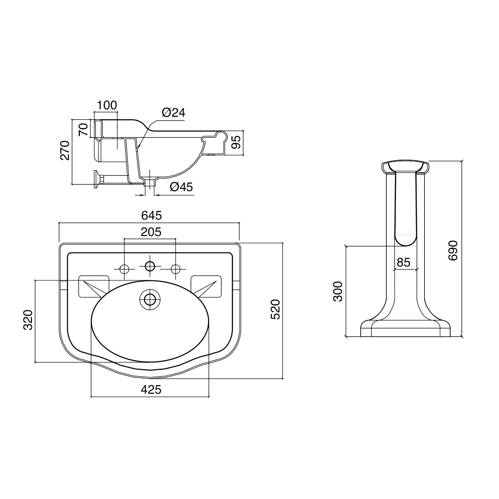 - An 64,5 x P 52 x Al 69 cm con salpicadero y borde salpicadero 1-3 agujeros grifo - An 645 mm;