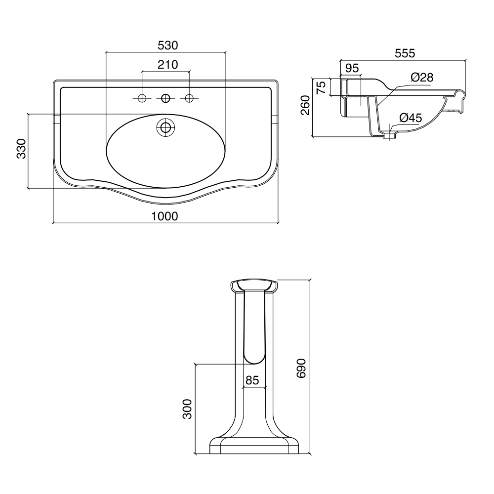 - L 100 x P 55,5 x H 69 cm con salpicadero y borde salpicadero 1-3 agujeros para grifo - L 1000 mm;