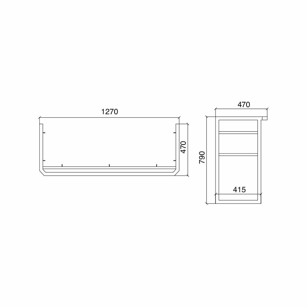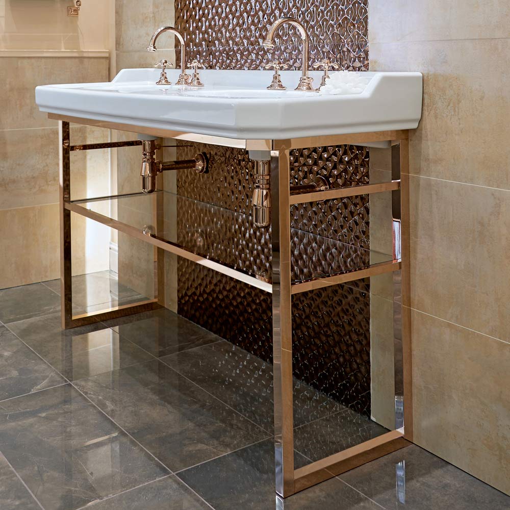 1 o 3 orificios de grifo por lavabo (especifique el número requerido de orificios al realizar el pedido), 1350 mm de largo, sostenido por una estructura compuesta de pies de metal en el acabado de oro rosa.