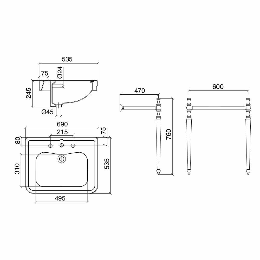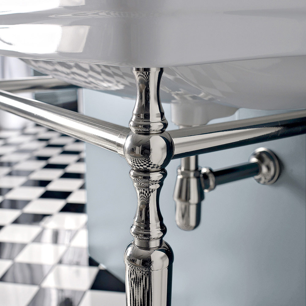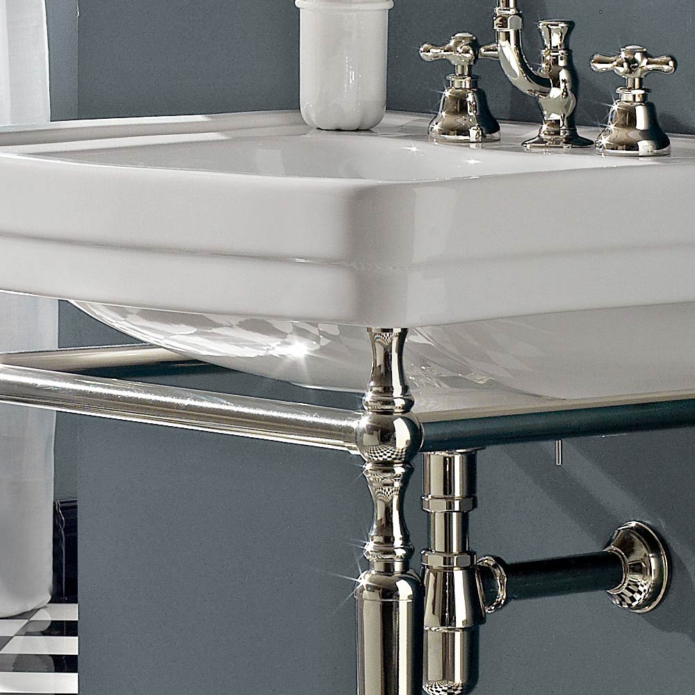 El fregadero es de cerámica con 1 o 3 orificios para grifería (especificar al realizar el pedido) y tiene una longitud de 650 mm. La base está hecha de metal con acabado de níquel.