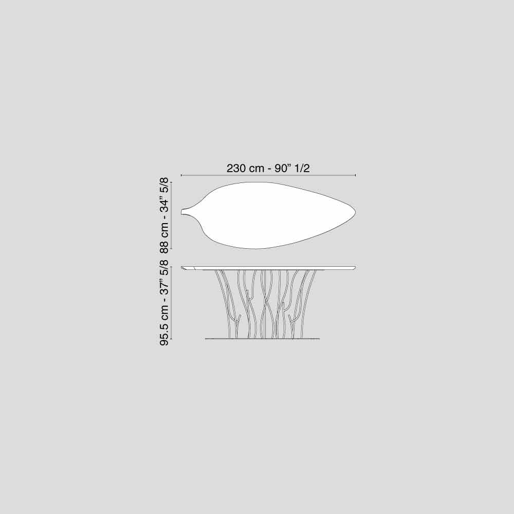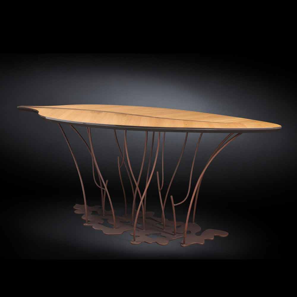 Consola de diseño único e inimitable, su peculiaridad esencial consiste en el tablero perfilado en forma de hoja, realizado en MDF de alta densidad, contrachapado de roble con diseño "de espiguilla", y en la parte central de nogal. Con acabados de poliéster vitrificado. Su base de sustentación representa una verdadera "escultura", caracterizada por "ramas" en metal pintado efecto corten. Fenice lleva consigo la unicidad de su diseño; de hecho, roble, nogal y acero se funden en un abrazo cálido e indisoluble.