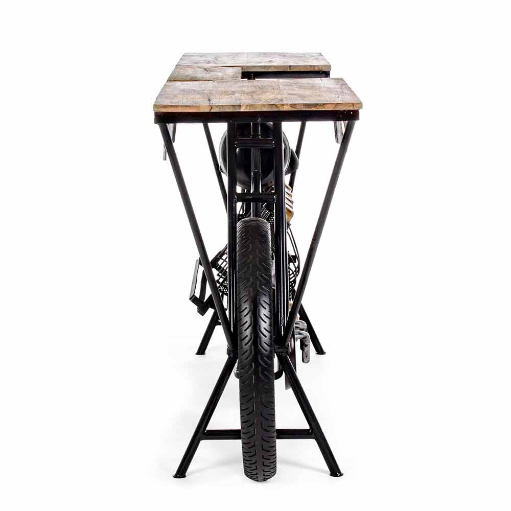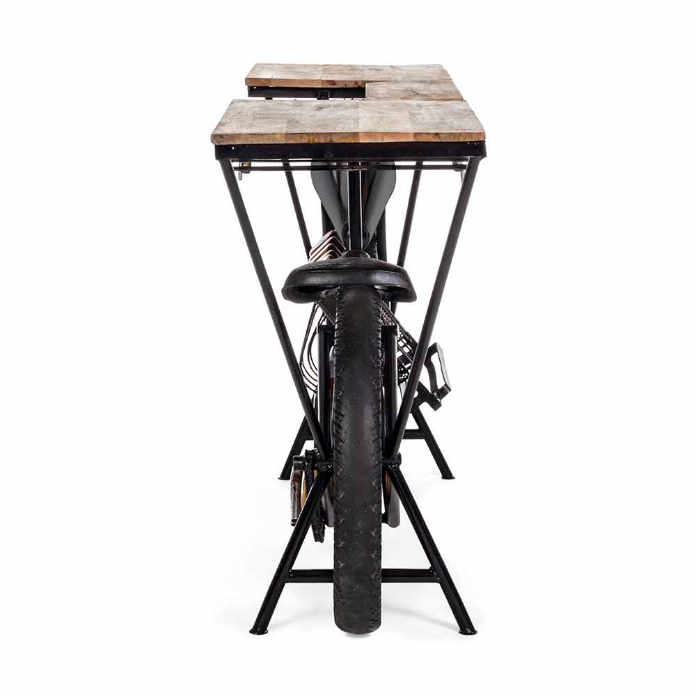 Consola de acero original y moderna con tapa de madera de mango y portabotellas.