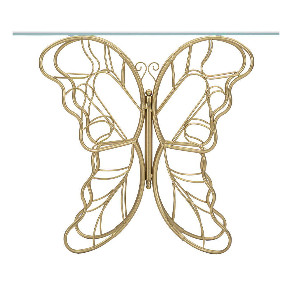 Consola fija moderna con estructura de hierro acabado dorado y tapa de cristal transparente . Estética y funcionalidad se unen para dar vida a un original complemento de decoración con alma romántica que se caracteriza por la particular conformación de la base que recrea la elegante forma de una mariposa enriqueciendo así el diseño final del producto. La perfecta combinación del acabado dorado de la base y el toque sofisticado de la tapa de cristal hace de esta consola un elemento decorativo ideal para quienes buscan un estilo creativo y les encanta amueblar los espacios de su hogar con objetos de fuerte personalidad refinada .