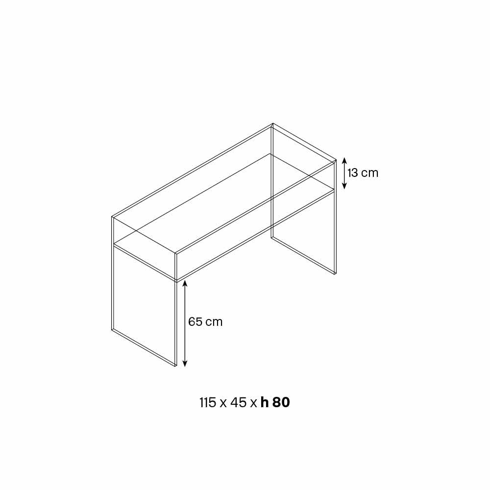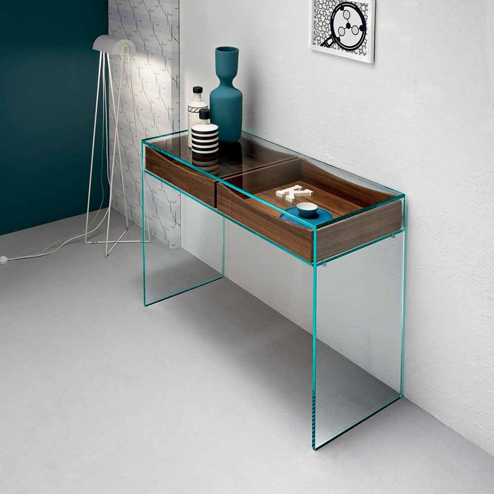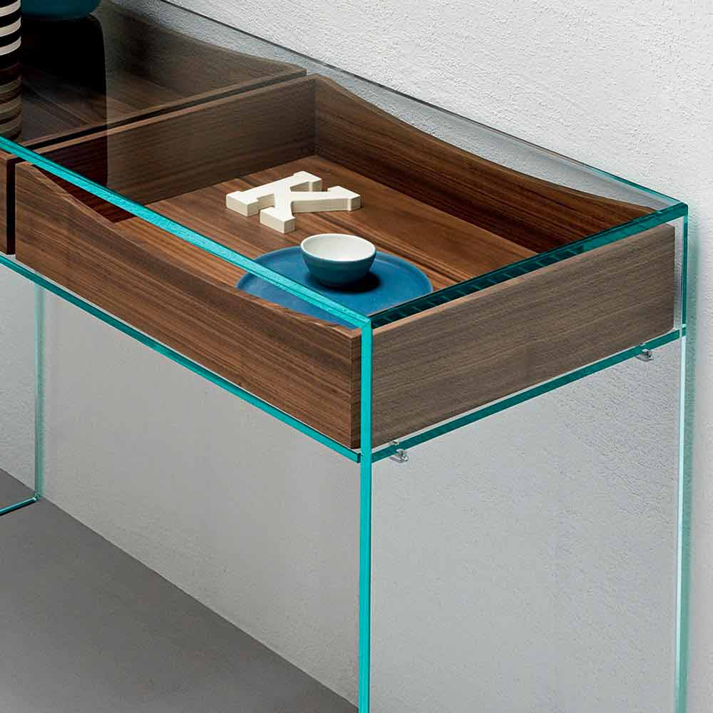 La consola es un mueble que se puede utilizar transversalmente en varios contextos y tiene una estructura de puente simple y lineal de vidrio extraclaro con dos cajones subyacentes en nogal canaletto.