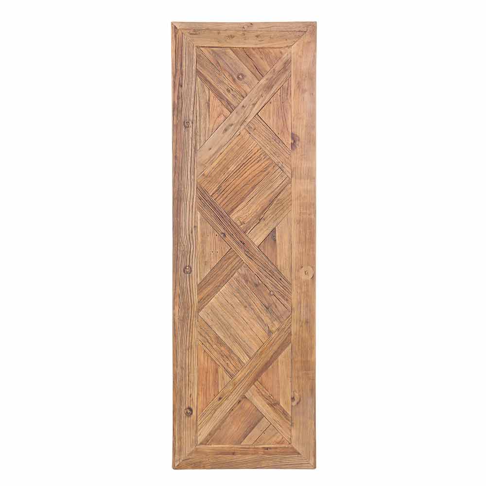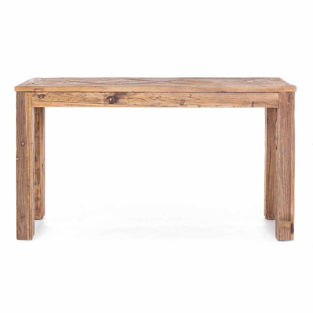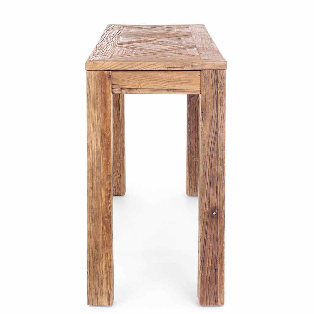 Esta consola de diseño está fabricada íntegramente con madera de olmo reciclada, con el tablero decorado con un acabado de parquet envejecido y un acabado a base de nitrocelulosa.