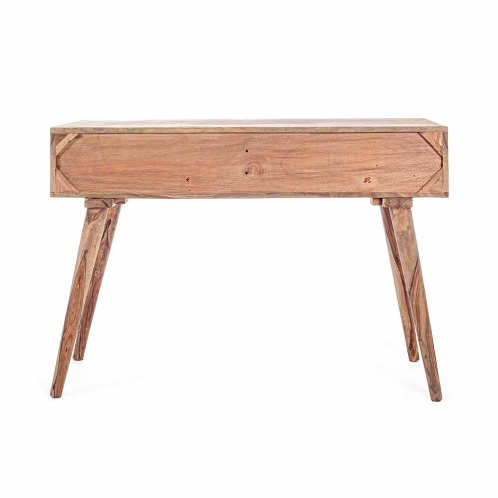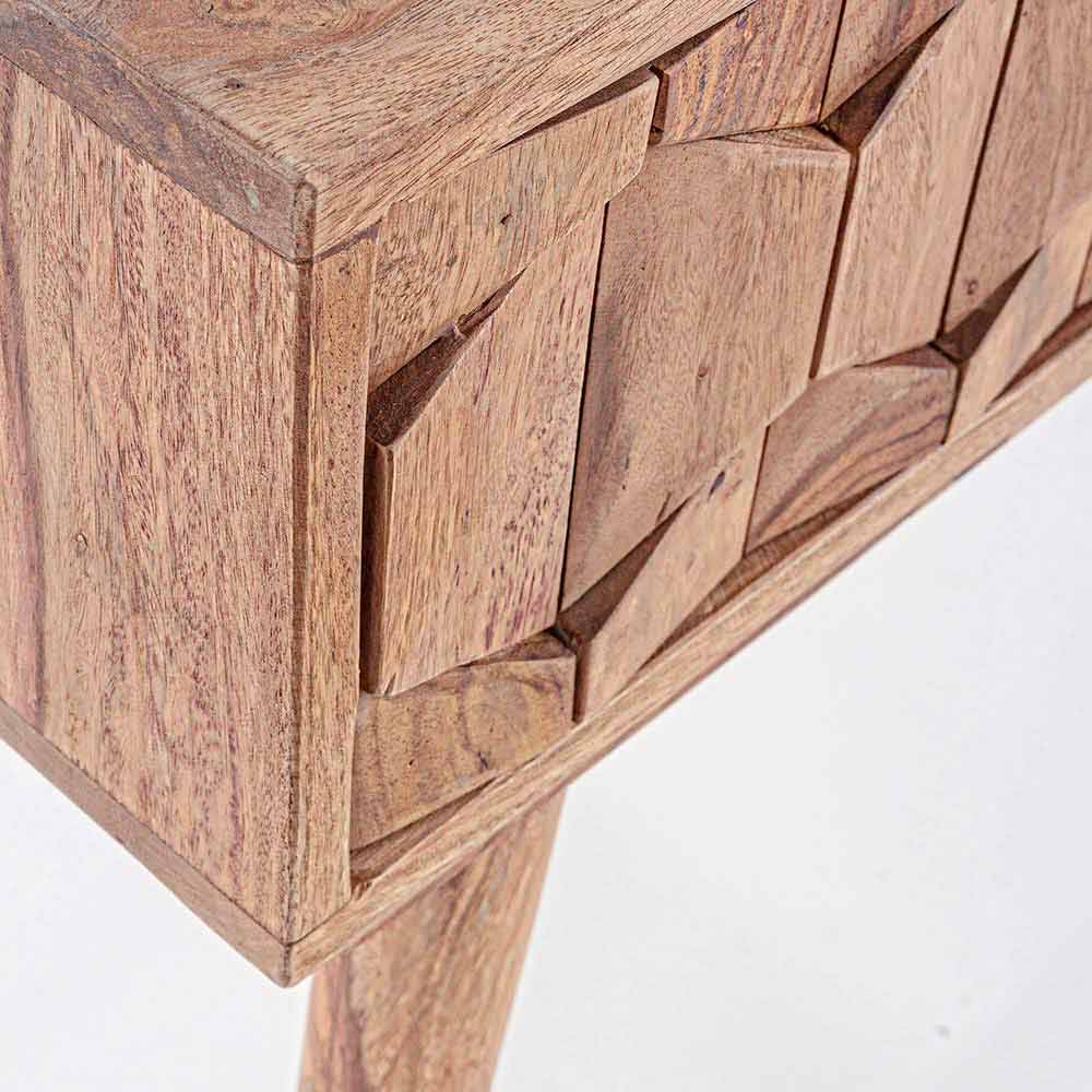 Esta consola de diseño está hecha de madera de sheesham fina con un acabado natural. Es una madera de espesor medio conocida por su brillo natural; por esto y por su durabilidad en el tiempo es ideal en la producción de muebles. Diseñado con dos cajones por detrás y por abajo en madera contrachapada con acabado natural, mientras que el frente está decorado. Los elegantes pomos de acero completan la escena.
