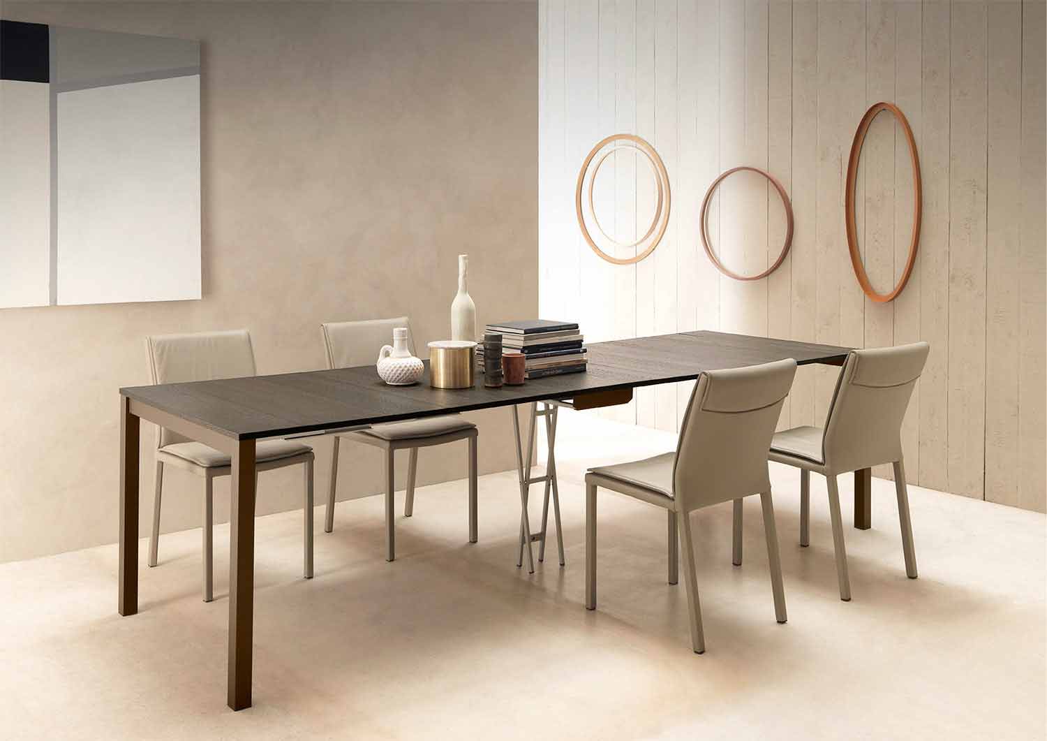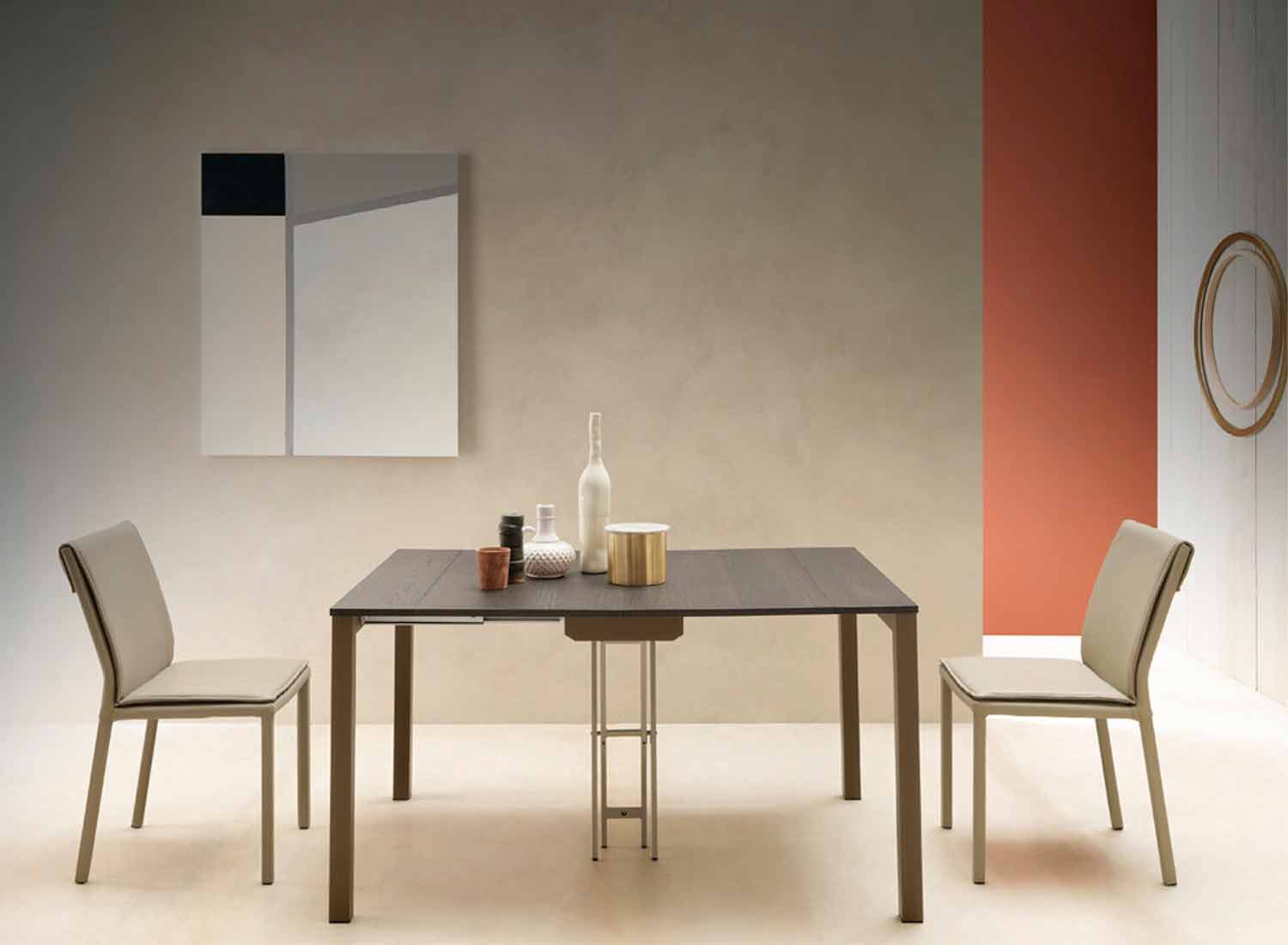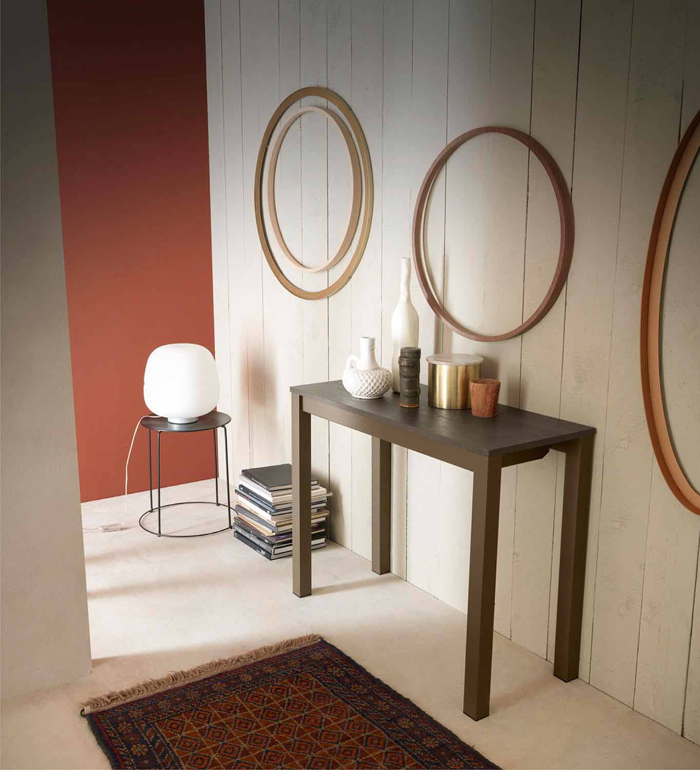 Su peculiaridad es la transformación de consola en mesa de comedor gracias al mecanismo telescópico de aluminio.