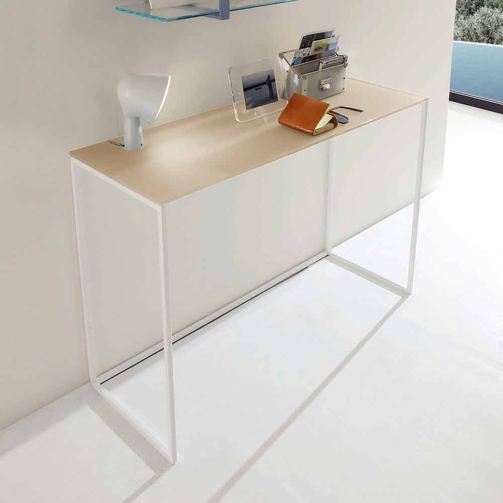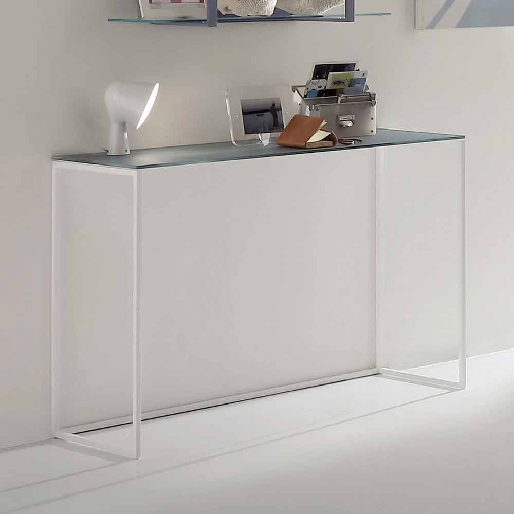 Consola moderna fabricada en Italia con tapa de cristal y estructura de metal pintado de blanco . Una solución de decoración simple y versátil, capaz de caracterizar cualquier espacio dando un toque de estilo al entorno circundante. Sus líneas esenciales le permiten desempeñar el papel de una práctica superficie de apoyo en diferentes áreas de la casa como la entrada o el salón, demostrando al mismo tiempo un perfecto elemento decorativo capaz de completar el mobiliario. Gracias a la elección que combinas la indiscutible modernidad del metal con la elegancia atemporal del cristal y sus maravillosos acabados, el resultado final ofrecerá una idea innovadora y original capaz de hacer que cada estancia sea única, aunque en su extrema sencillez.