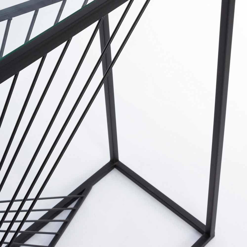 Esta consola de diseño tiene una estructura rectangular mínima en acero con recubrimiento de polvo epoxi y una tapa de vidrio templado .