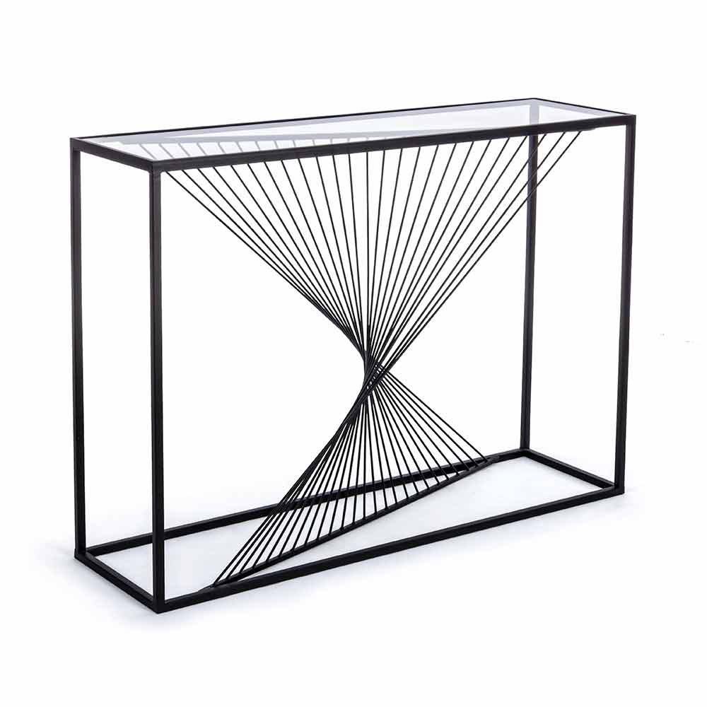 Moderna consola rectangular en acero y cristal con juego de formas.