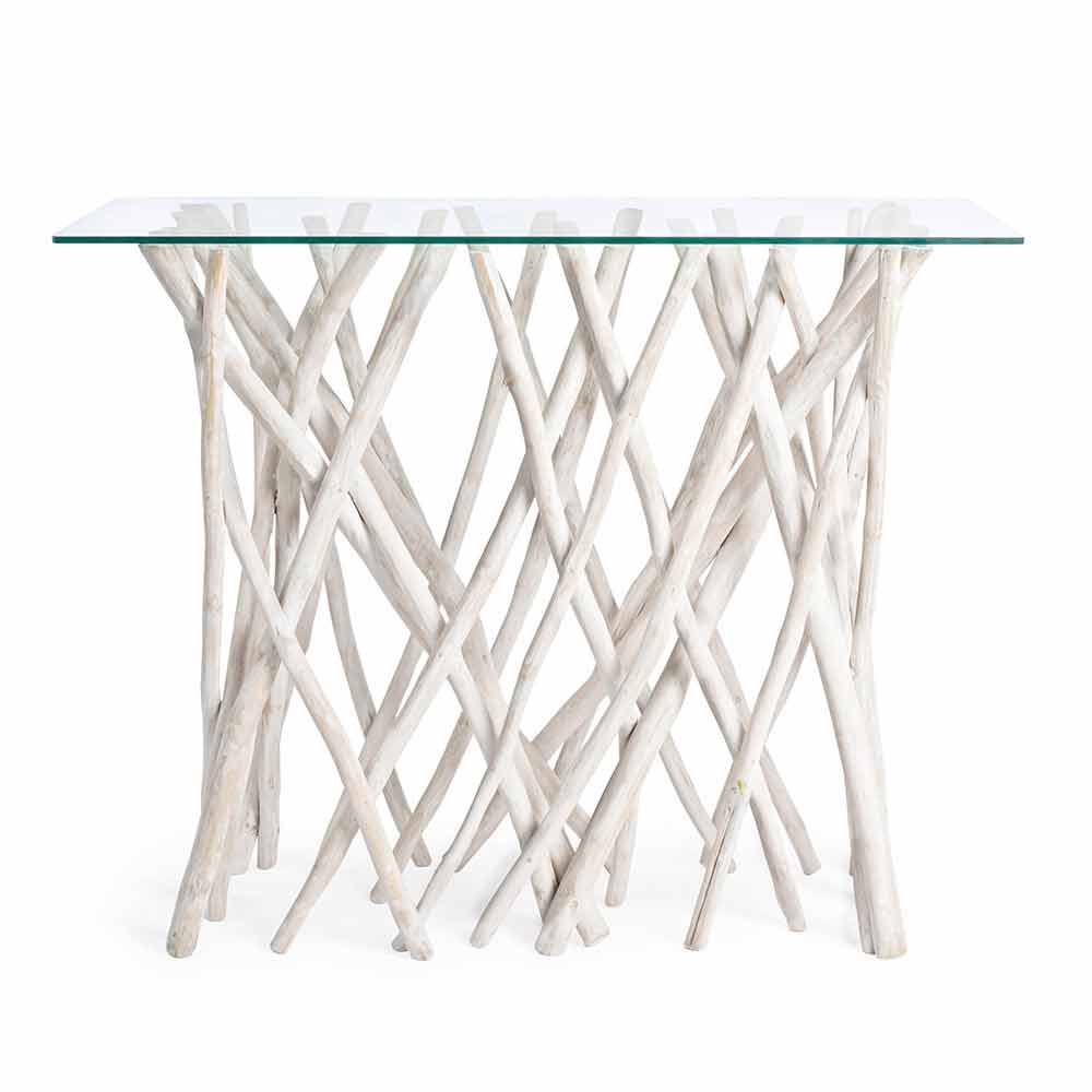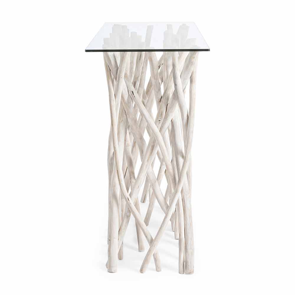 Esta consola de diseño está realizada con una tapa de cristal no templado de 8 mm de espesor sostenida por una base de ramas de madera de teca blanqueada con acabado natural.