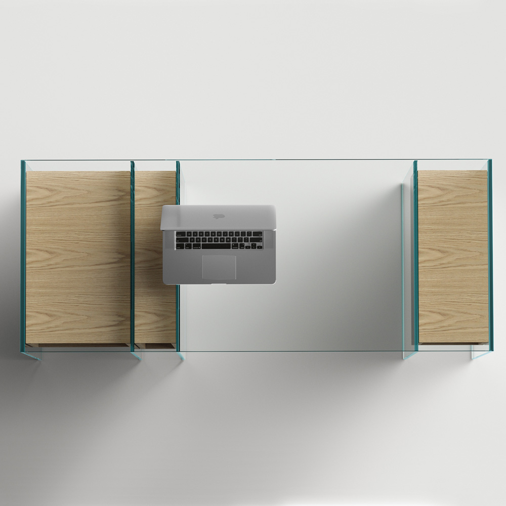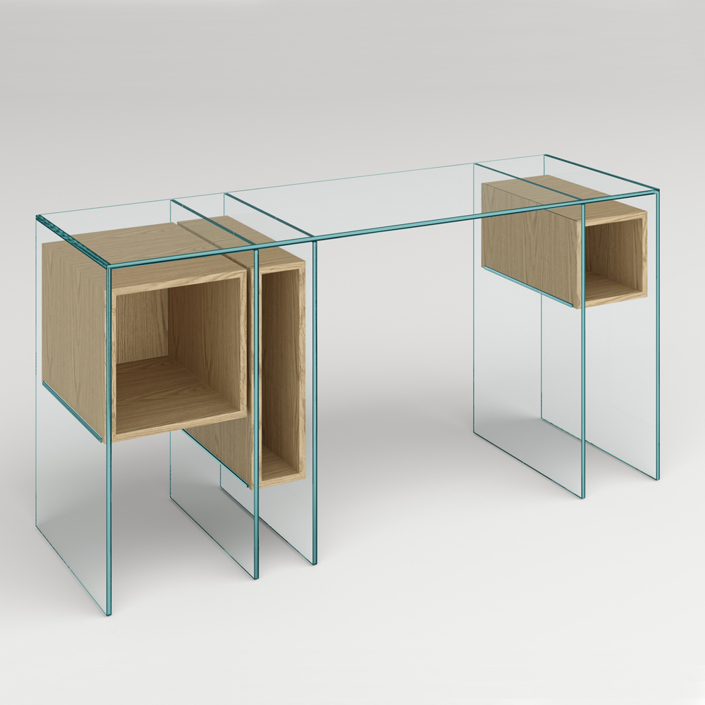 Consola de escritorio en vidrio extraclaro con detalles de madera Made in Italy.