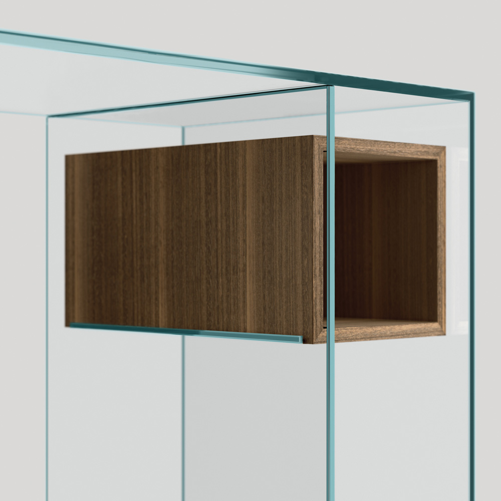 NB : la consola también está disponible en la versión de cristal ahumado. También es posible solicitar el juego de 3 cajones en acabado a juego (insertados en el interior del cubo izquierdo).