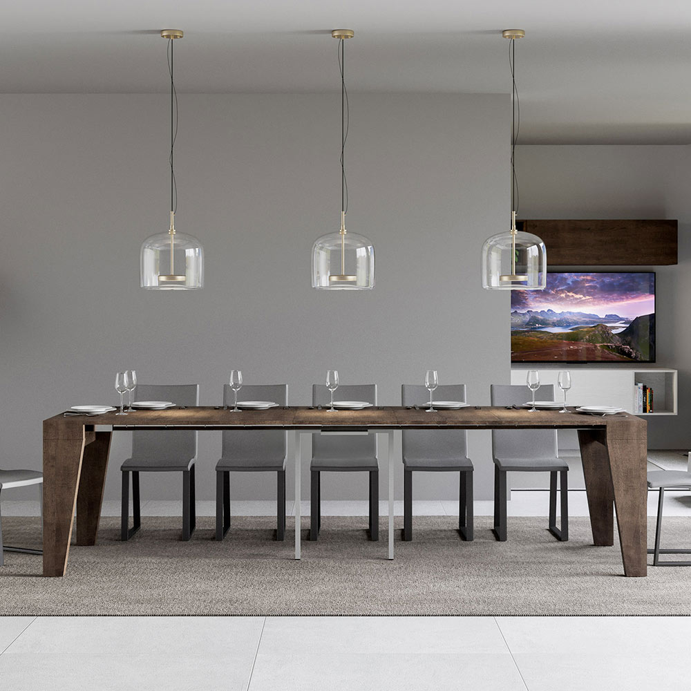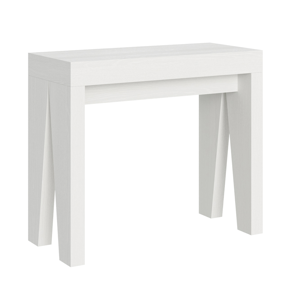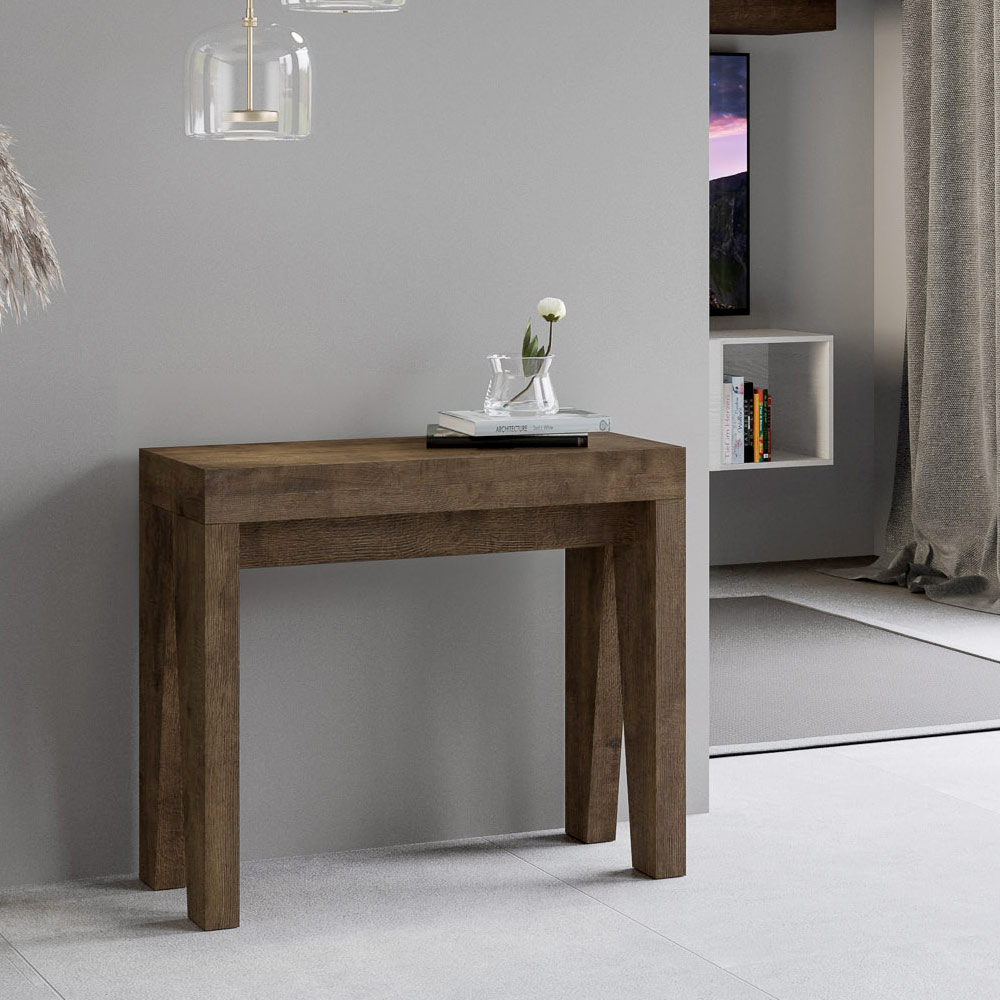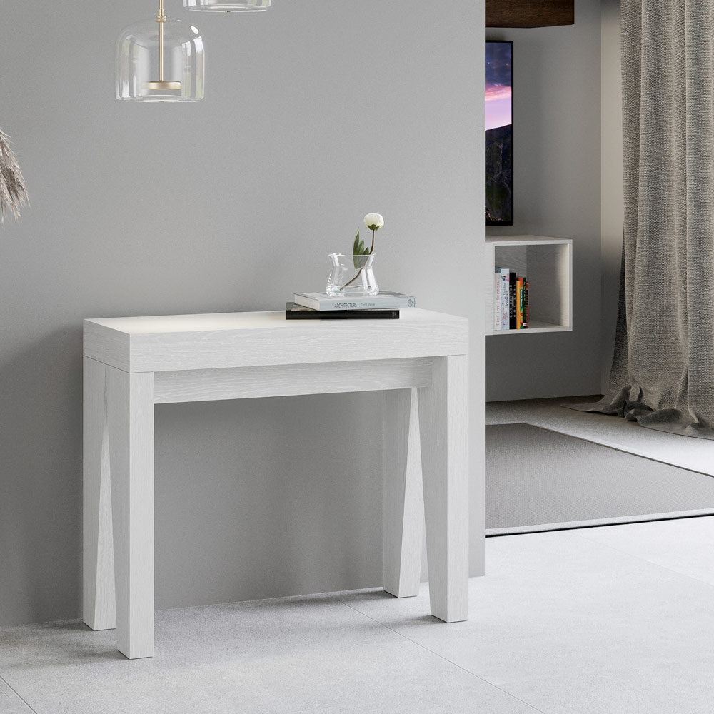 Esta mesa consola extensible es ideal para optimizar el espacio: compacta cuando está cerrada, se extiende fácilmente para proporcionar una superficie de trabajo o para una cena, convirtiéndose en un símbolo de versatilidad y adaptabilidad. È diseñado para aquellos que buscan una combinación de practicidadà y estilo sofisticado en sus muebles.
