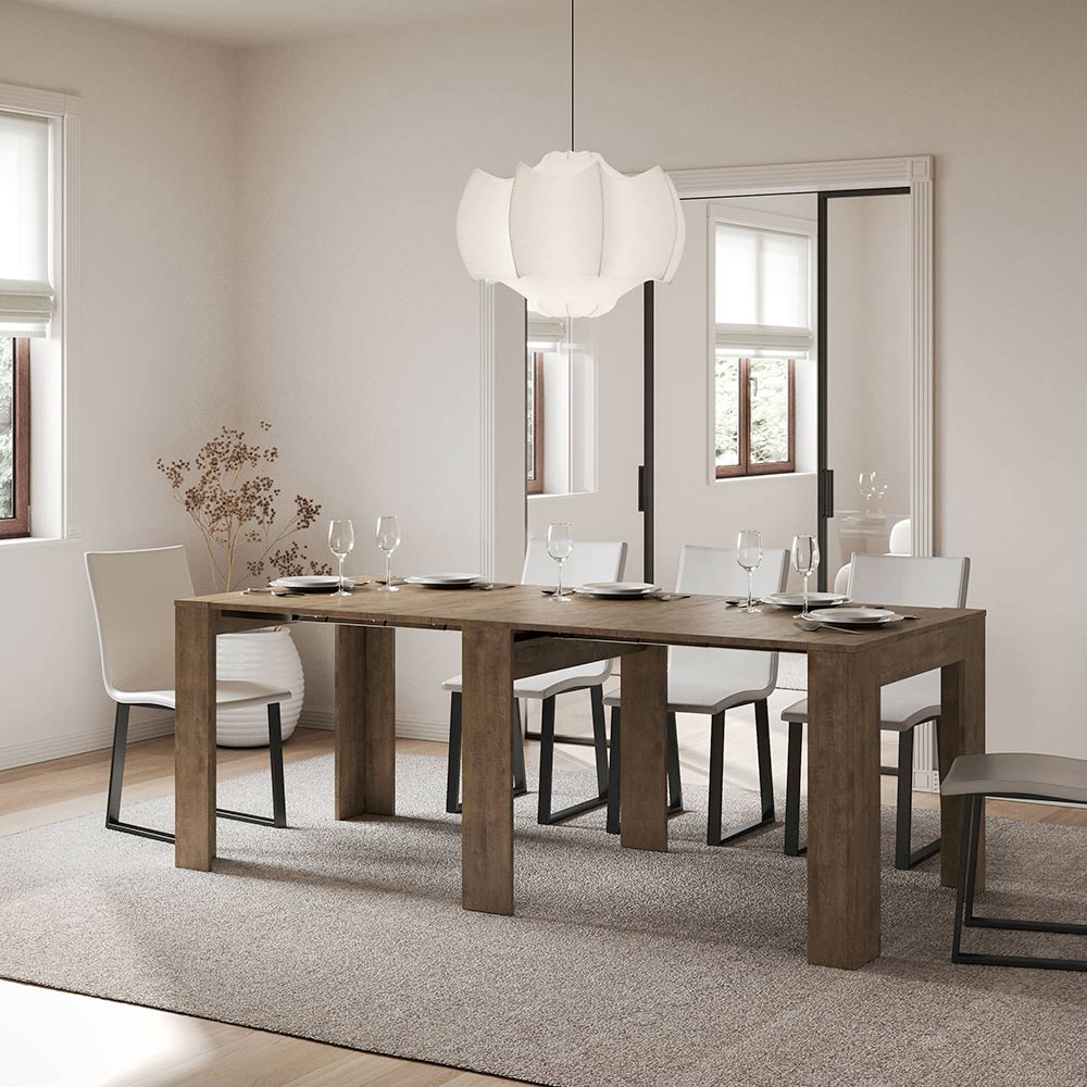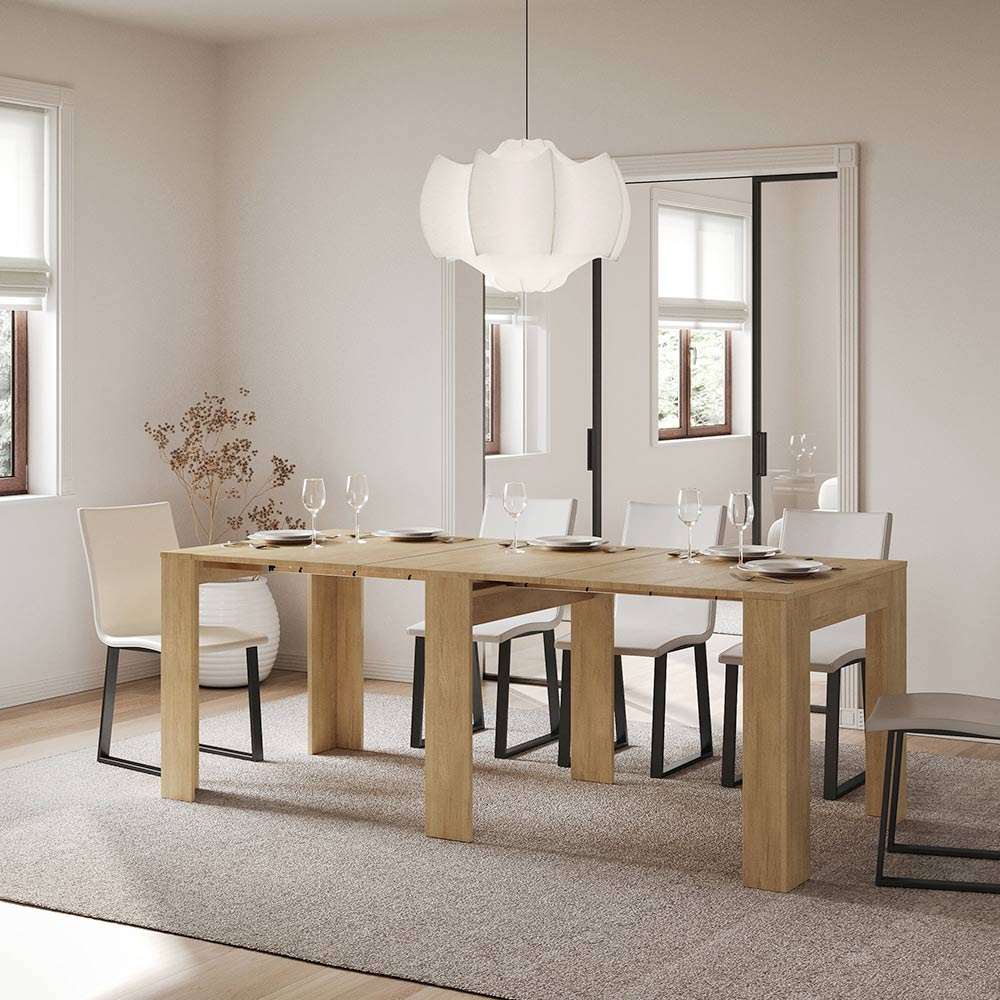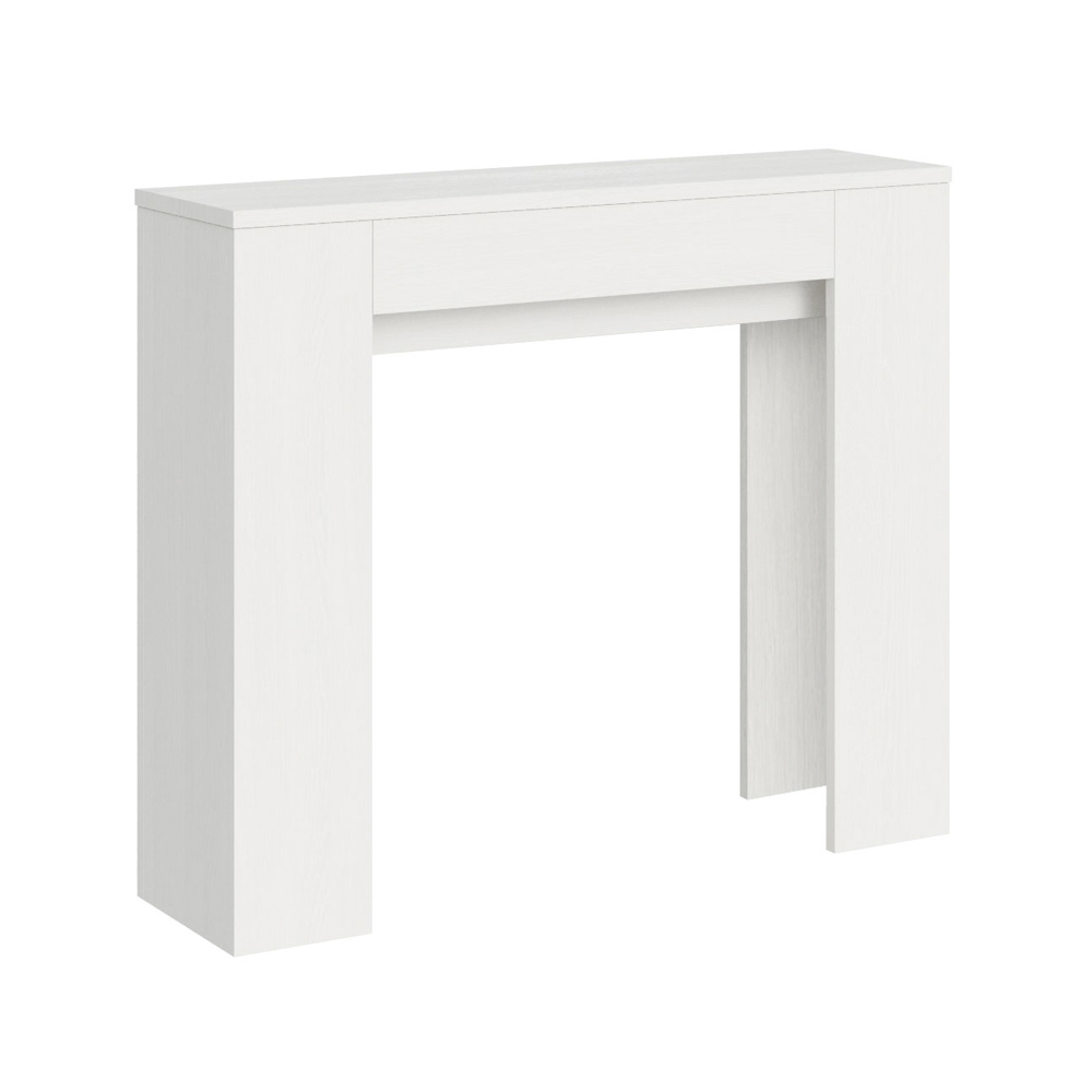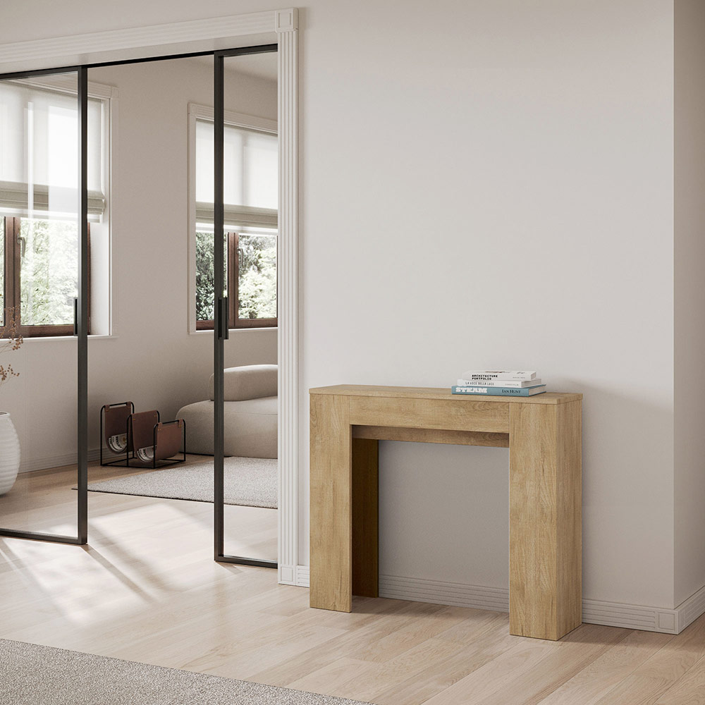 Esta consola extensible es el epítome del diseño funcional y minimalista. Su forma elegante y sus líneas limpias la convierten en una pieza de mueble versátil, ideal para cualquier espacio, desde la entrada hasta el salón, ofreciendo una imagen de espacio y orden. La mesa consola se expande con facilidad, transformándose de un discreto mueble a una práctica mesa de comedor, perfecta para recibir a amigos y familiares en ocasiones especiales. Esta versatilidad la convierte en una opción ideal para quienes viven en espacios reducidos pero no quieren sacrificar funcionalidad y estilo.