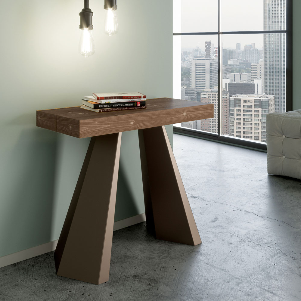 Esta consola extensible es una oda al diseño contemporáneo y a la funcionalidad dinámica. La superficie de madera acabada, finamente trabajada para resaltar las vetas naturales, descansa sobre dos robustas patas inclinadas de hierro, creando un contraste visual tan audaz como armónico.