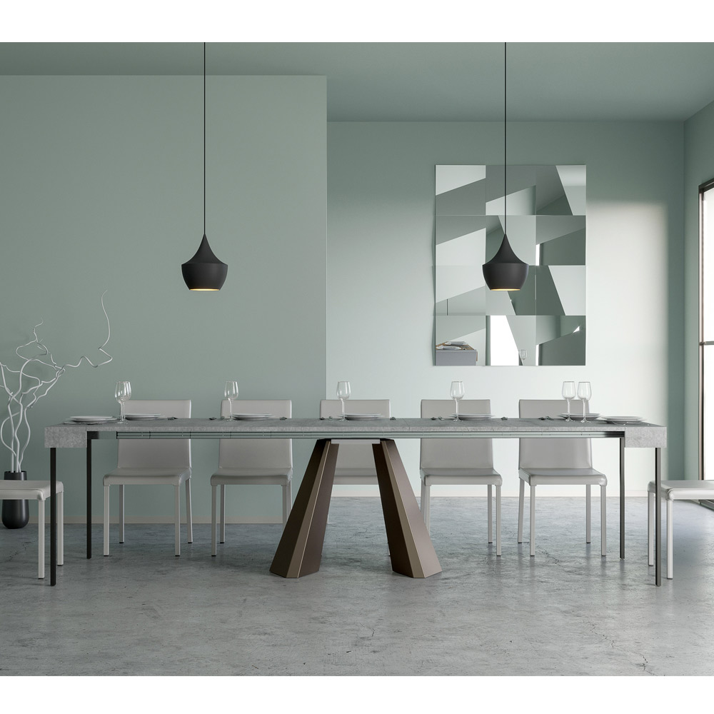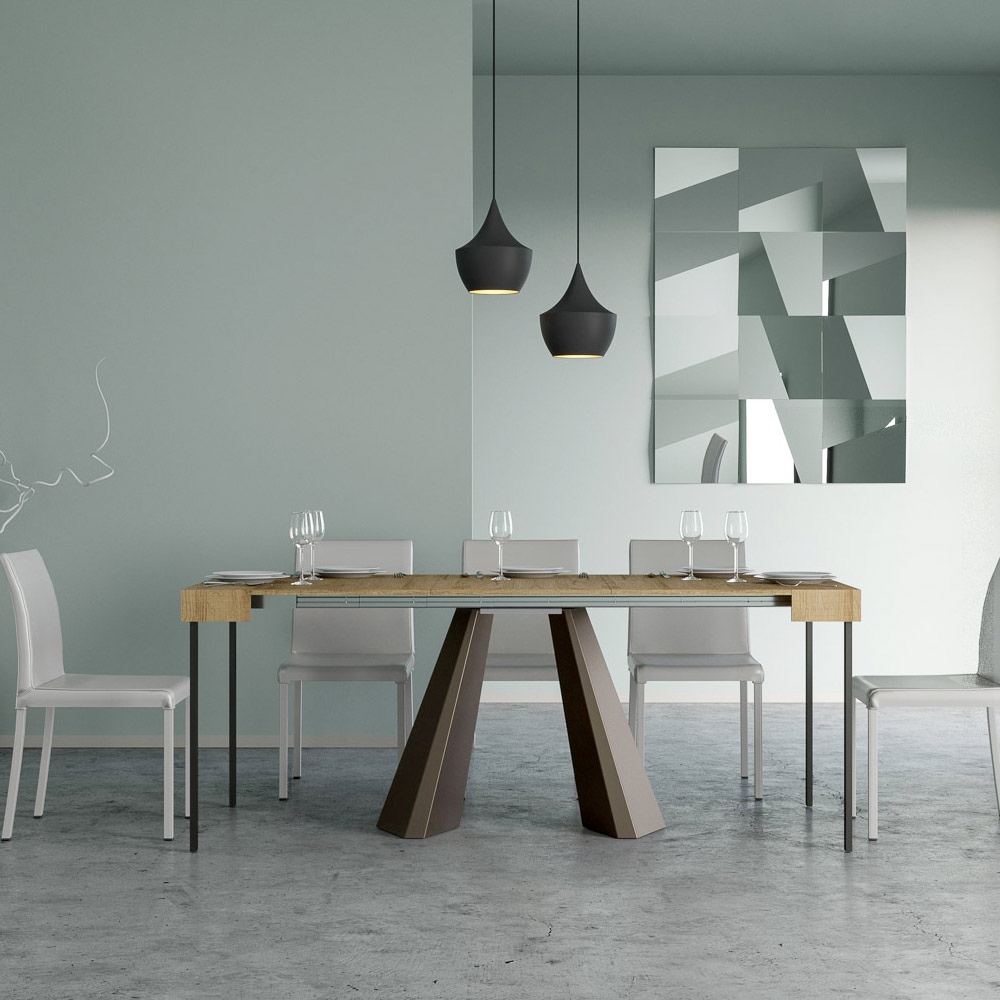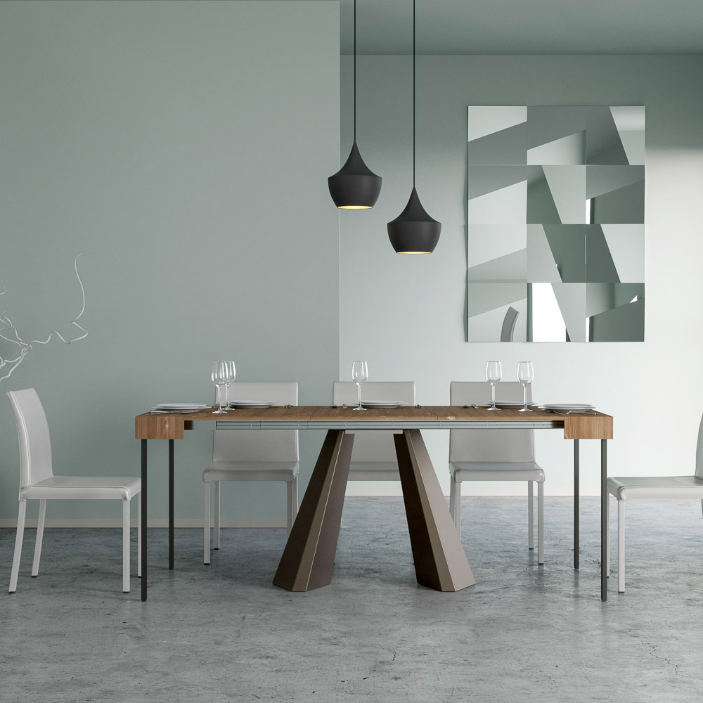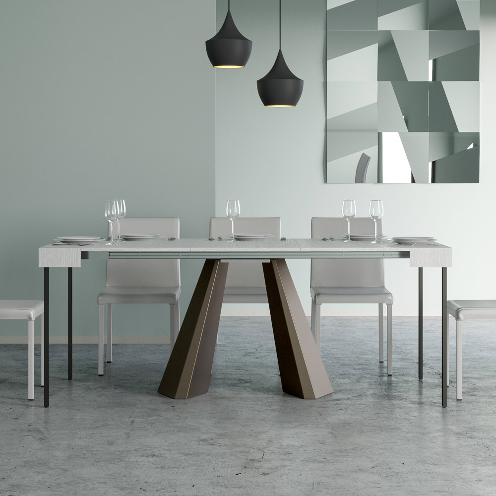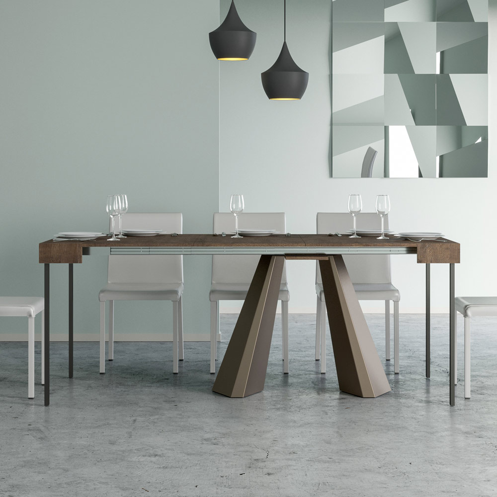 La singularidad de esta consola reside en sus patas, que recuerdan las formas geométricas de la arquitectura moderna, ofreciendo un aspecto escultural y vanguardista. Gracias a su sistema extensible, esta pieza transforma cualquier espacio de sencillo a extraordinario, extendiéndose para acomodar los momentos sociales o para proporcionar esa superficie extra que necesitas.