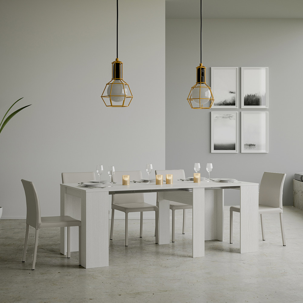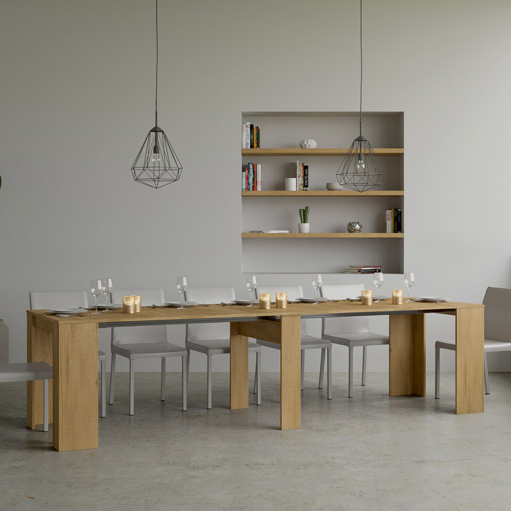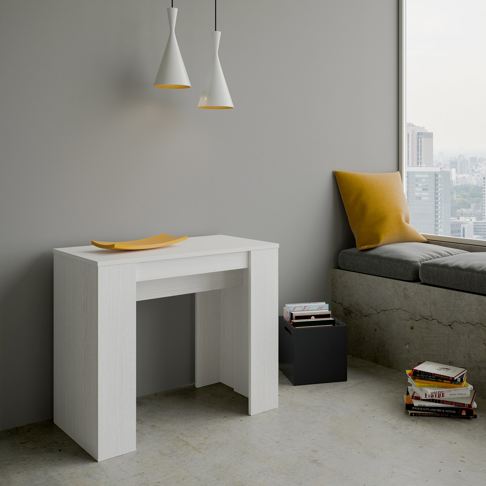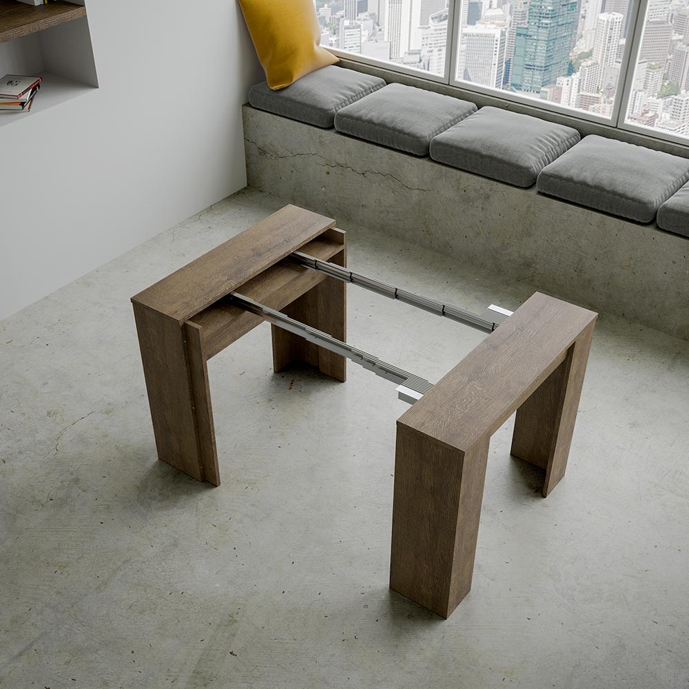 Esta consola extensible es una obra maestra de diseño contemporáneo y funcionalidad intuitiva. La parte superior y los laterales de madera maciza ofrecen una sensación luminosa y abierta, ideal para quienes buscan crear un espacio a la vez aireado y moderno. Su estética esencial y limpia la hace apta para cualquier ambiente, perfecta para encajar en un diseño minimalista o como contraste en uno más colorido y vivo.