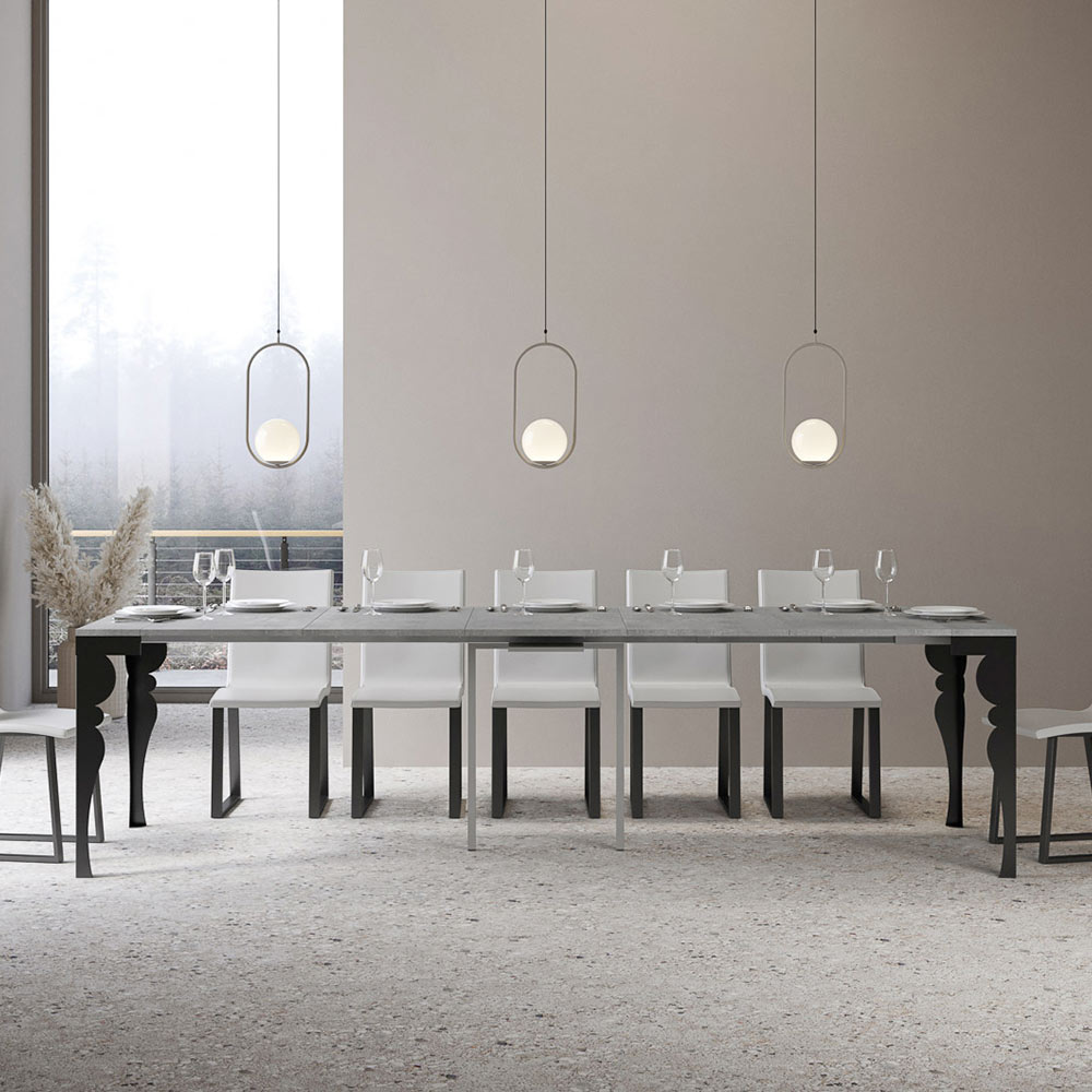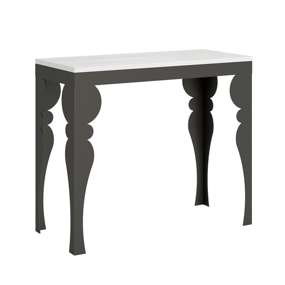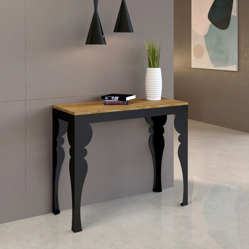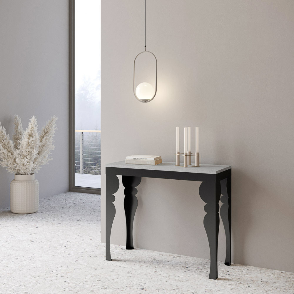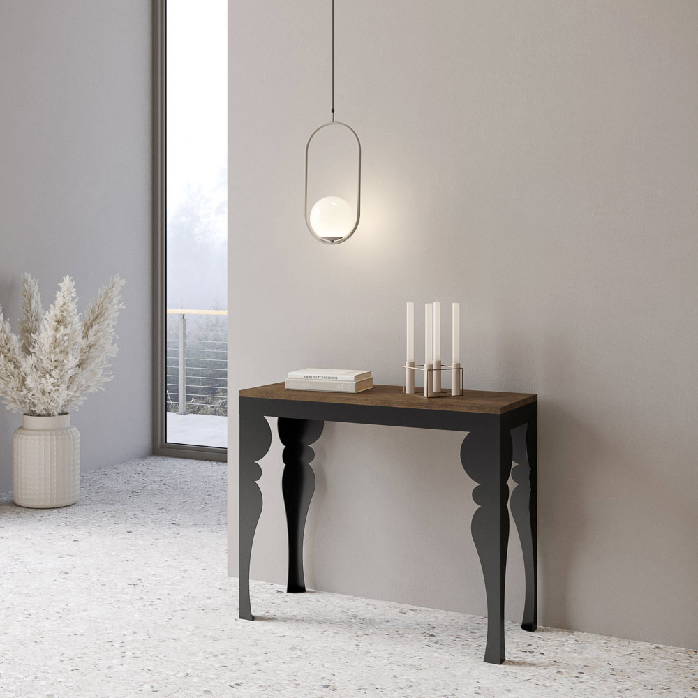 El contraste entre el gris antracita de las patas y la madera de la encimera crea un diálogo visualmente estimulante, haciendo de este mueble una elección sofisticada para cualquier estancia. Perfecta como mueble de entrada o como superficie adicional en una sala de estar, la mesa consola se transforma con facilidad, extendiéndose para convertirse en la pieza central de un comedor, lista para acoger momentos memorables.