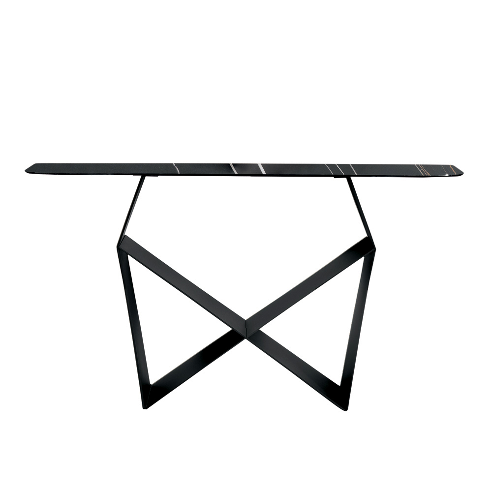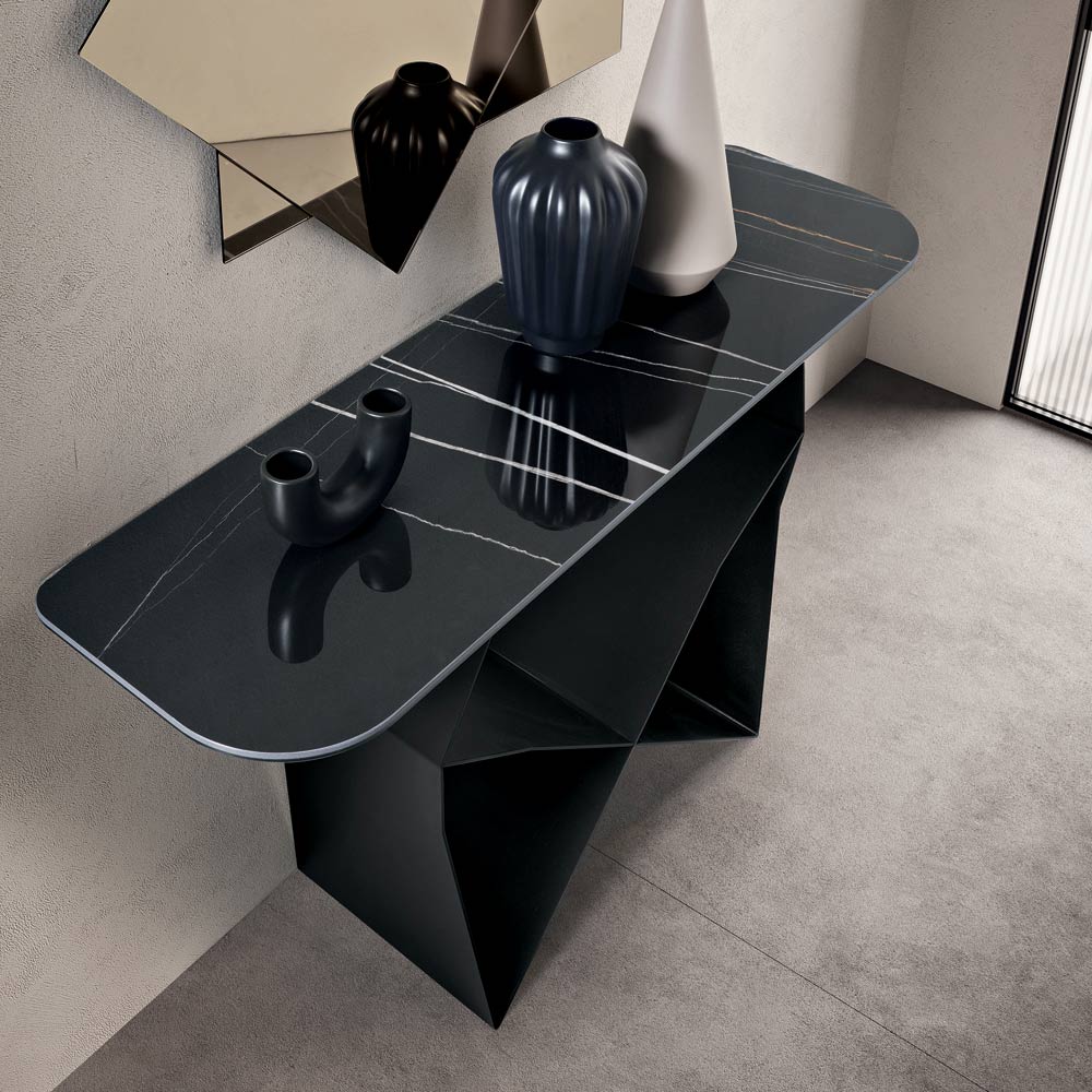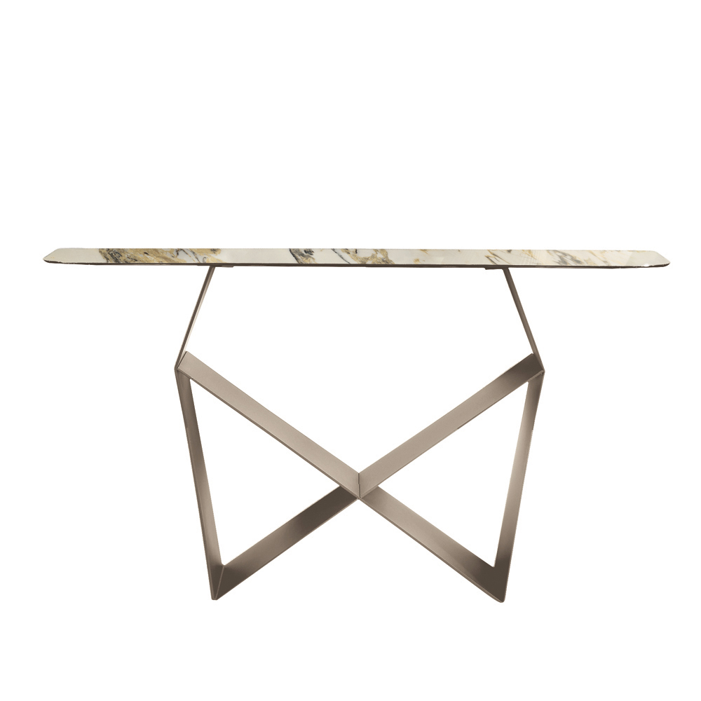 La estructura destaca por su base de metal pintado que crea una original forma de pajarita , generando un refinado juego de sólidos y vacíos. Este detalle aporta dinamismo y fuerza a la composición, dotando a la consola de una presencia impactante pero equilibrada.