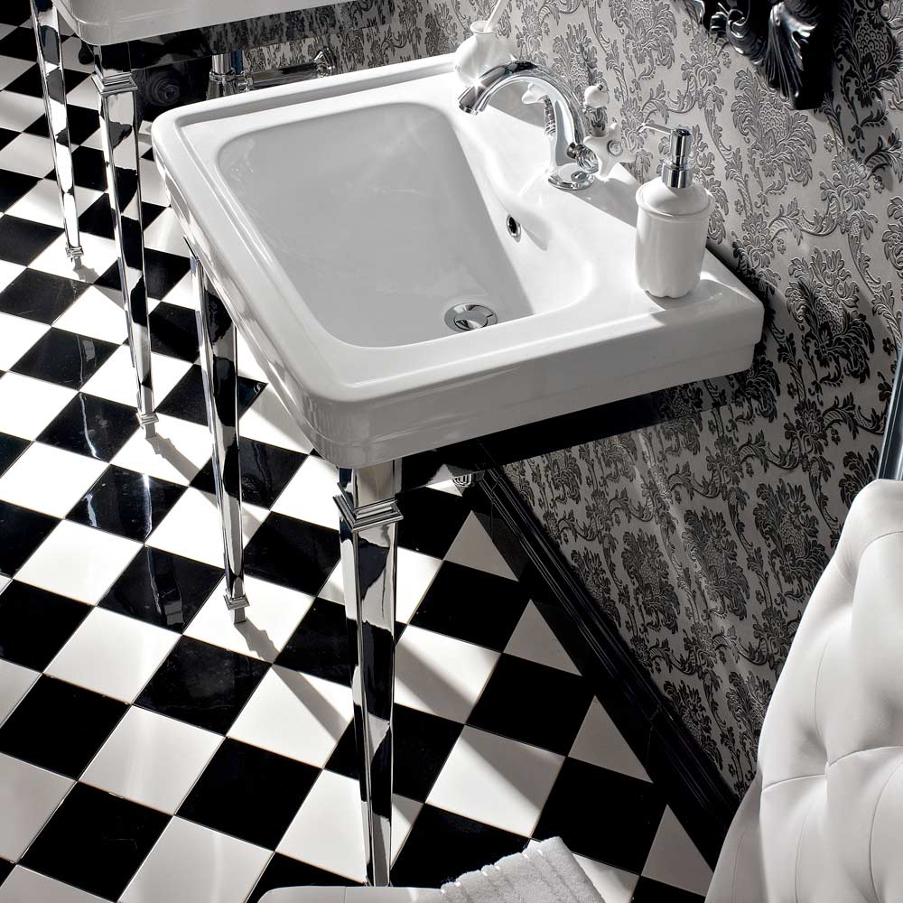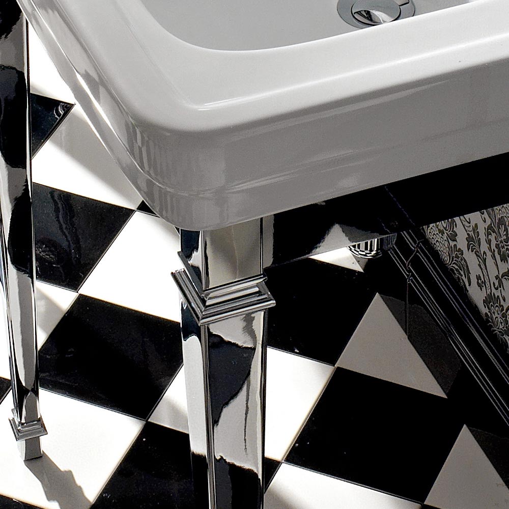 El fregadero está hecho de cerámica con 1 o 3 orificios para grifería (especifique la cantidad de orificios necesarios en el momento del pedido) y tiene 650 mm de largo. La base está hecha de metal con acabado cromado .