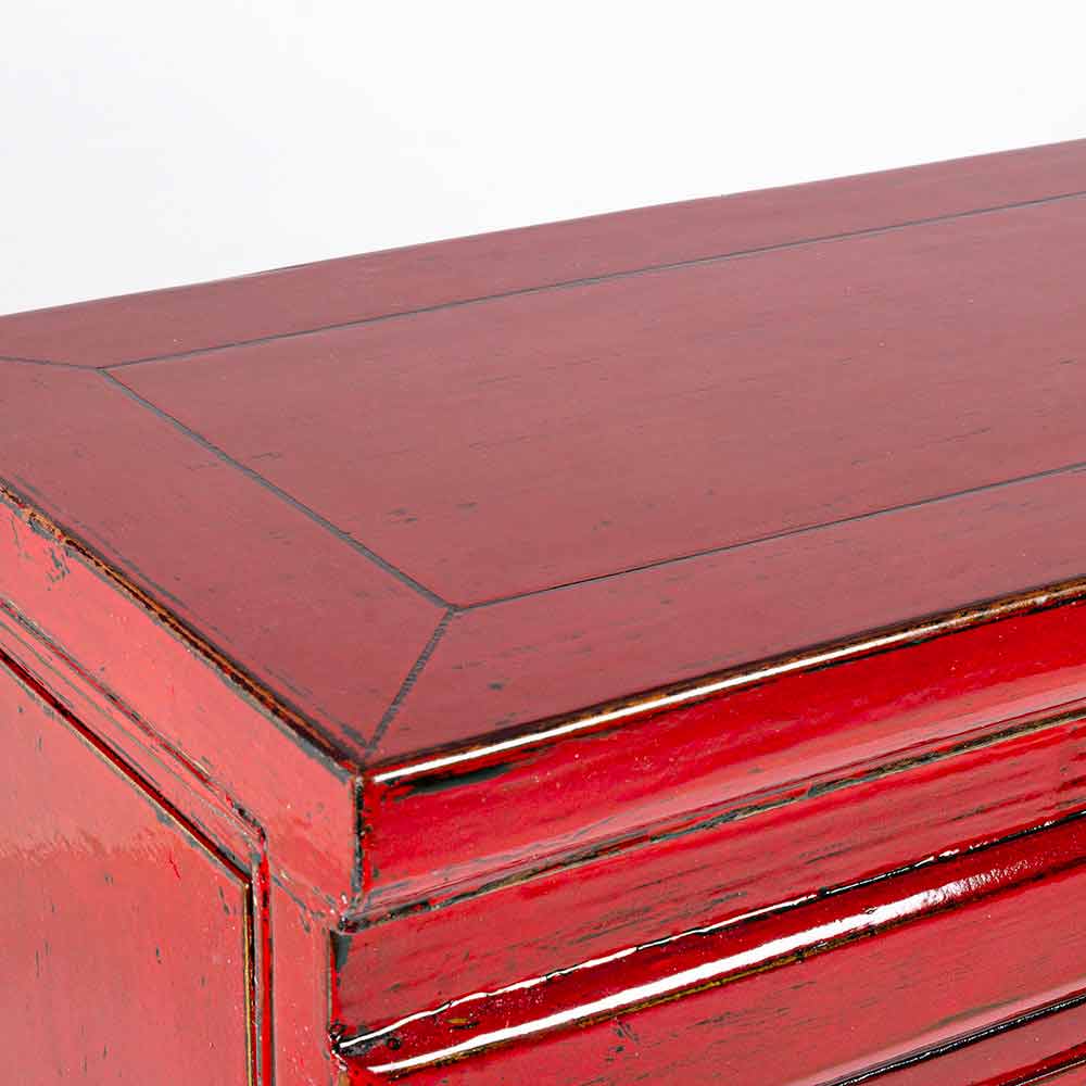 Consola roja en madera de olmo con 3 cajones en diseño vintage.