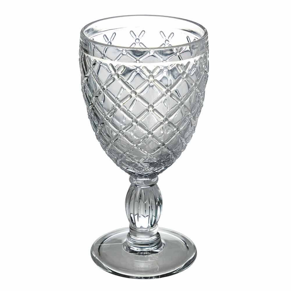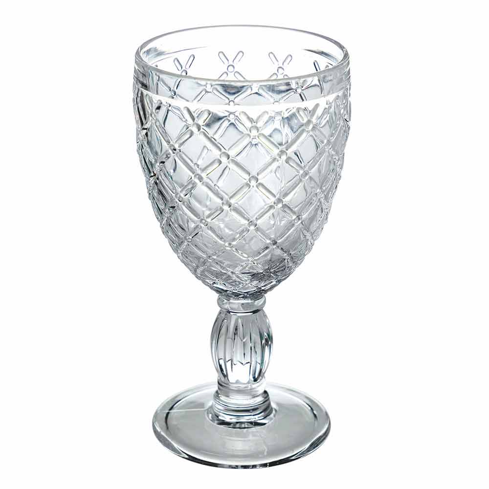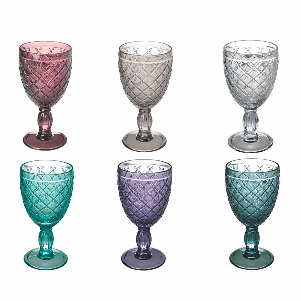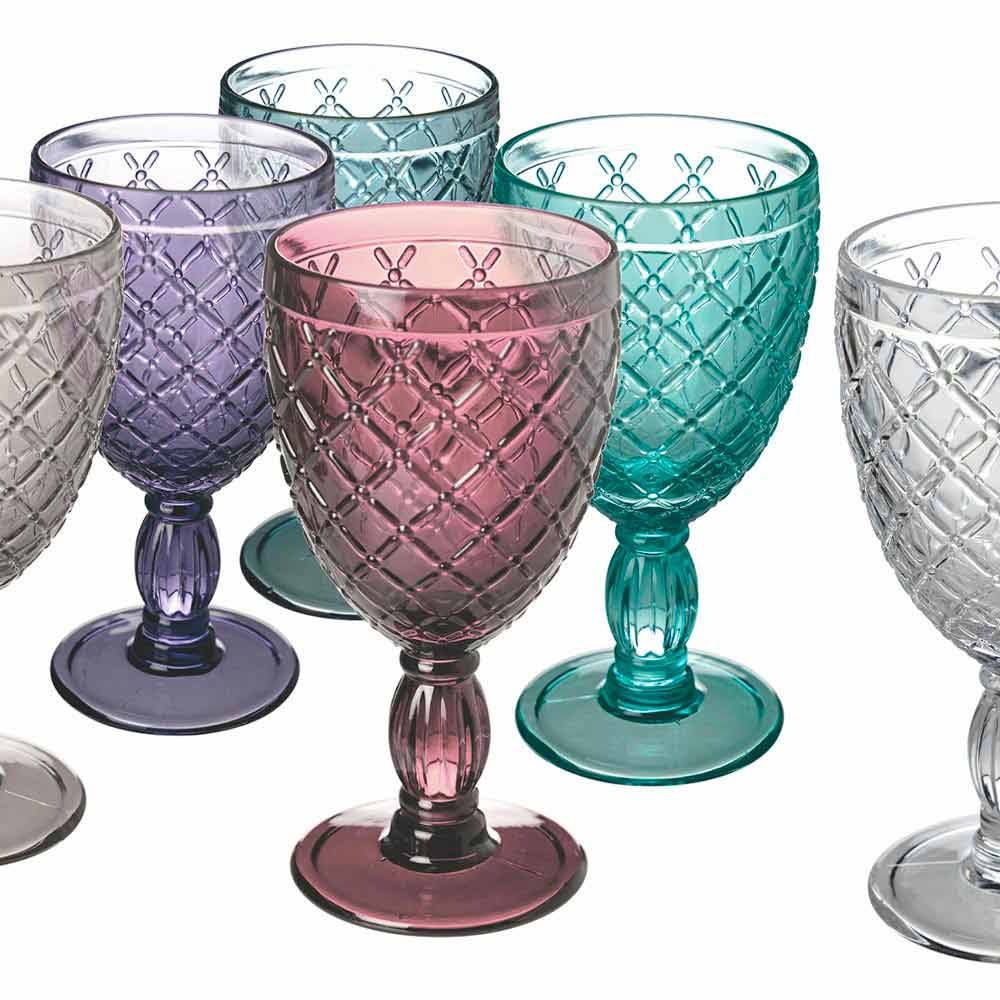 Juego de copas de vino o agua de colores o transparentes en vidrio con adornos tallados, 12 piezas.