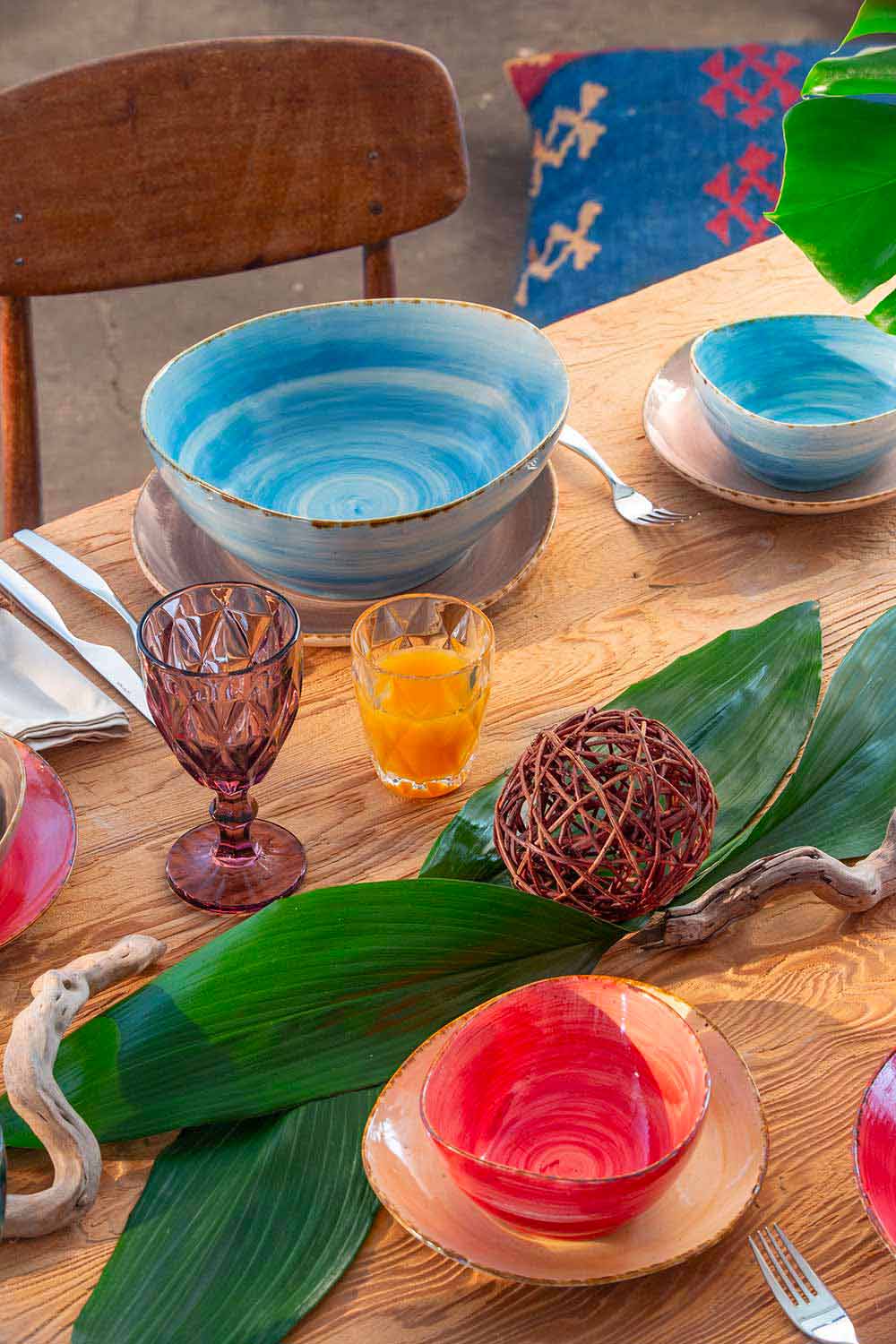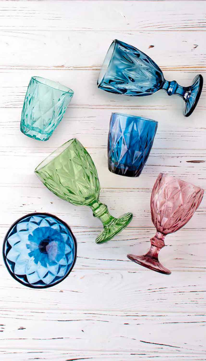 copas de cristal coloreado aportan un toque de elegancia y refinamiento a la mesa, gracias al precioso