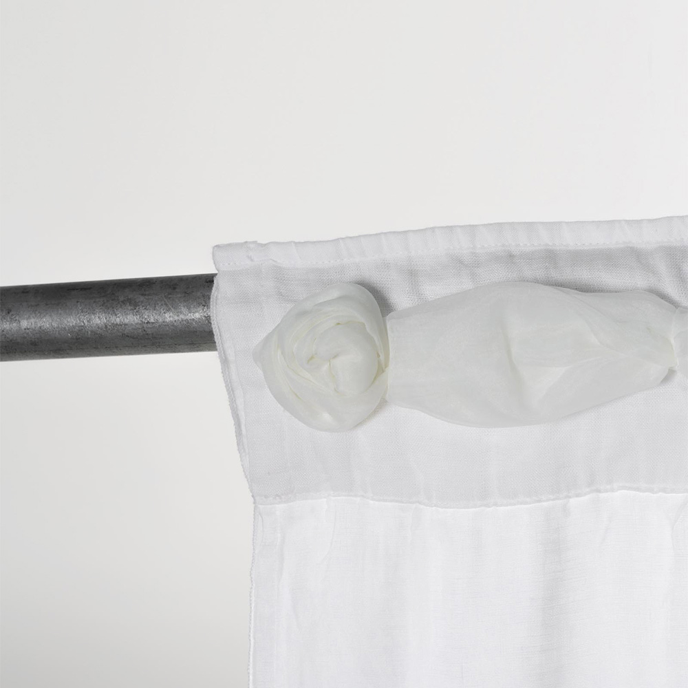 El valor de la tradición se combina con el estilo de vida moderno en esta cortina de lino y organza blanca clara con bordado horizontal en la zona superior y predisposición para la varilla en la parte superior.