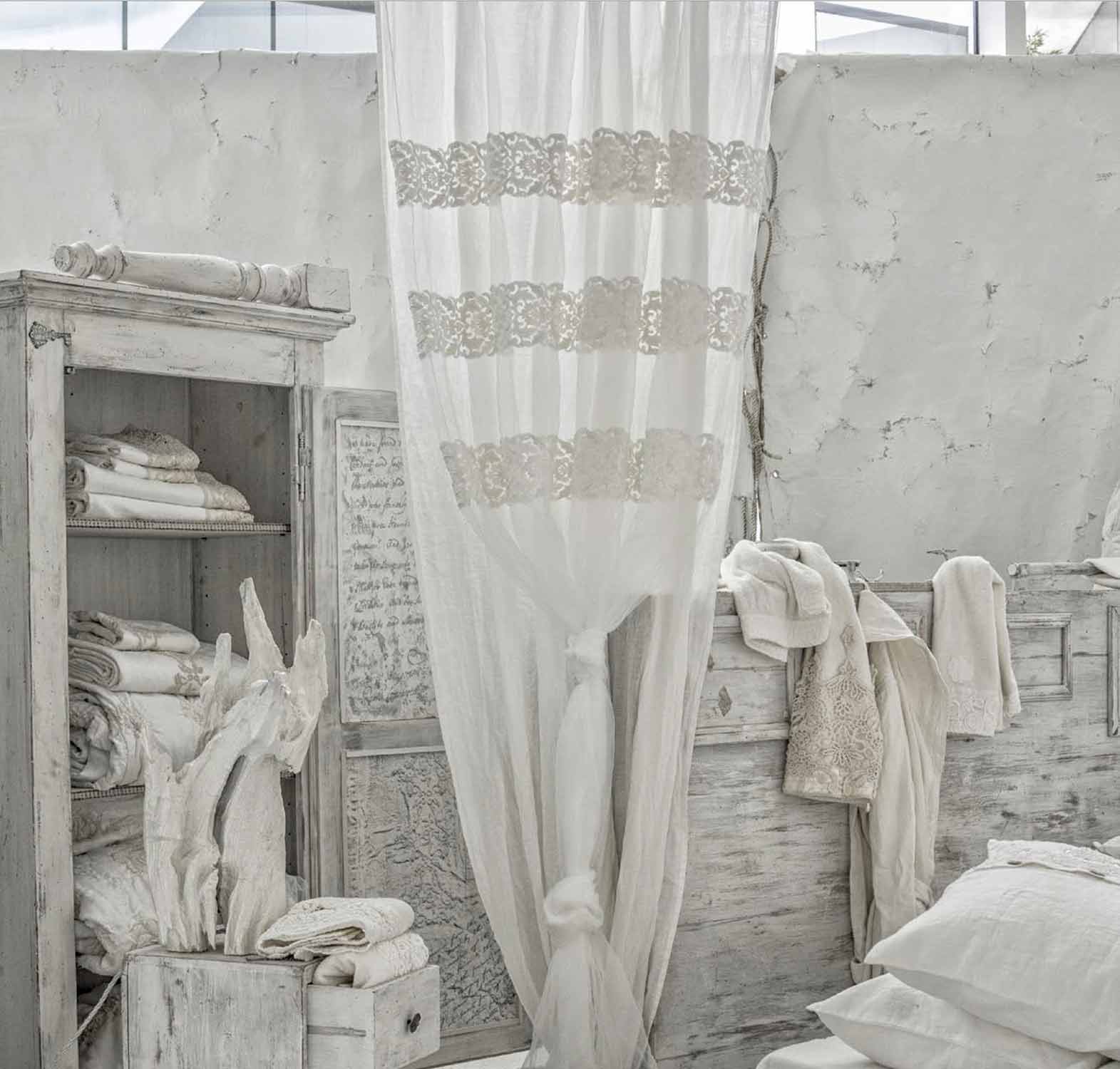 Cortina en lino y organza y bordado, diseño de artesanía de lujo made in Italy.